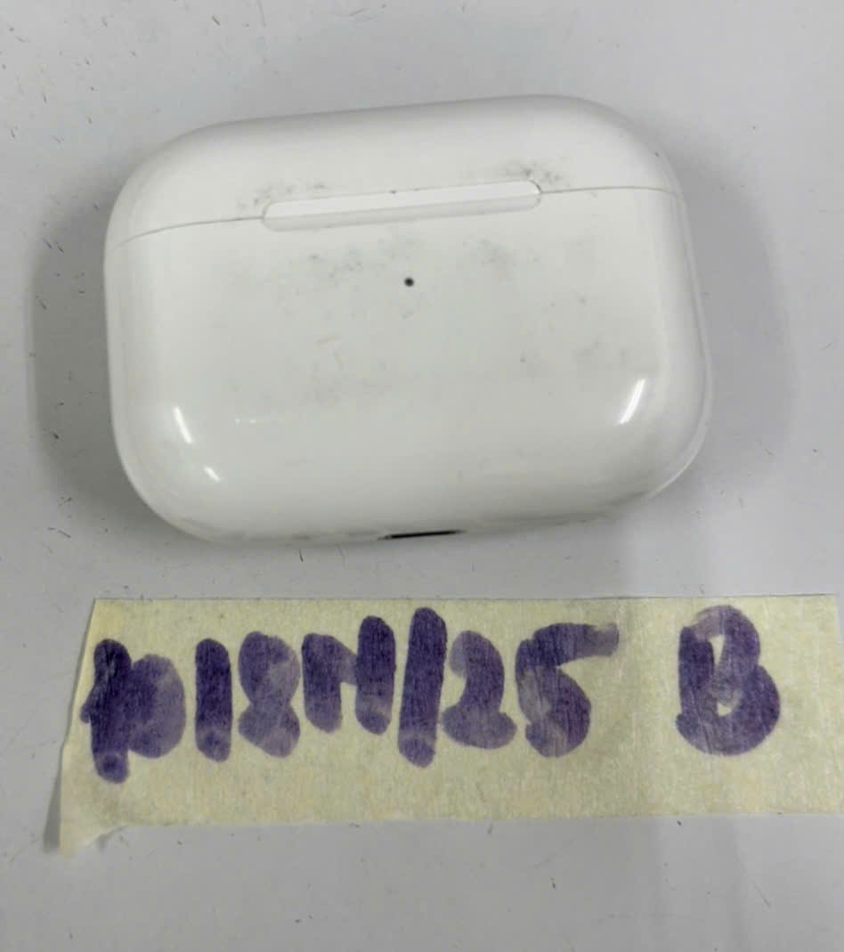 Ngày tiếp nhận: 03/6/2025 Mã hồ sơ: 1018N2025B Mô tả: 01 hộp sạc tai nghe bluetooth màu trắng có chữ APPLE, bên trong có 02 tai nghe màu trắng. |