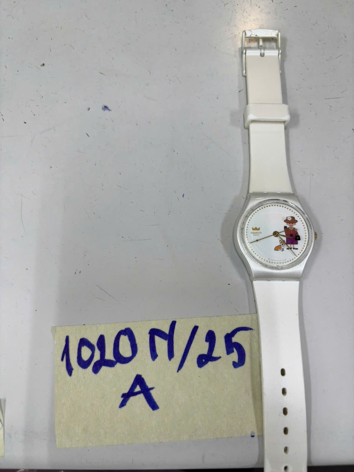 Ngày tiếp nhận: 03/6/2025 Mã hồ sơ: 1020N2025A Mô tả: 01 đồng hồ kim loại mặt tròn màu trắng có logo chữ SWATCH SWISS dây nhựa màu trắng mặt sau có chữ SR1130SW. |