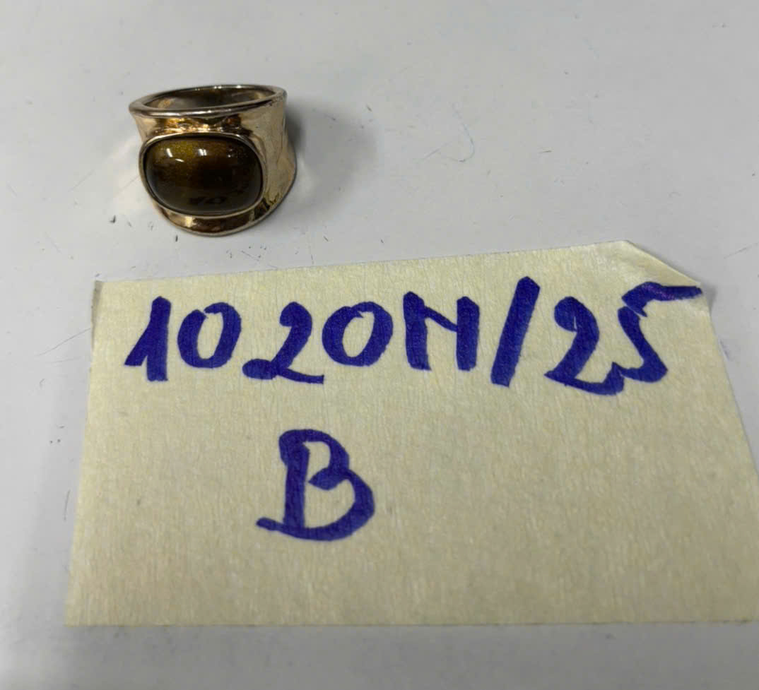 Ngày tiếp nhận: 03/6/2025 Mã hồ sơ: 1020N2025B Mô tả: 01 nhẫn kim loại màu vàng không rõ nhãn hiệu, mặt nhẫn có đính hạt màu nâu. |