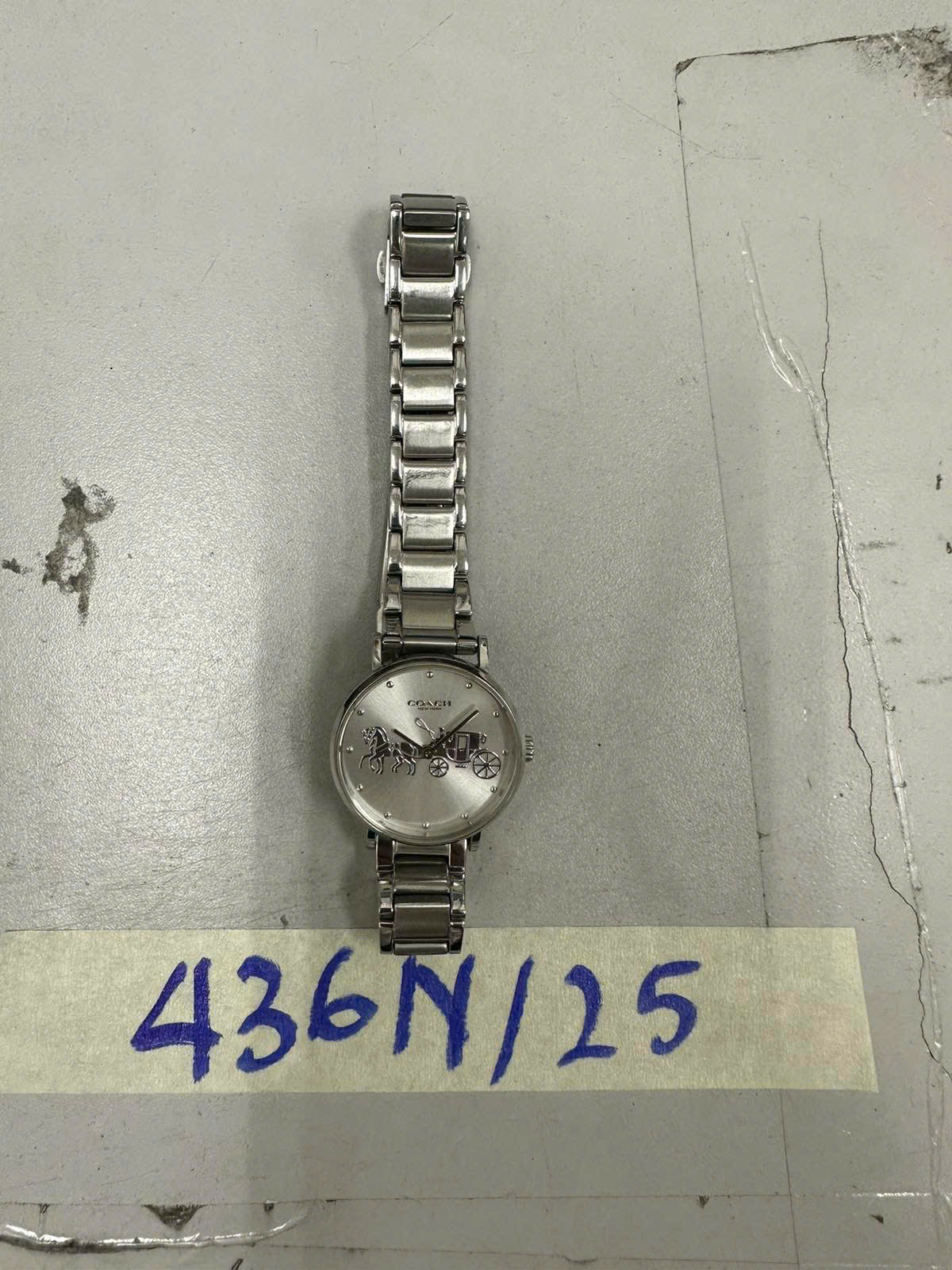 Ngày tiếp nhận: 06/03/2025 Mã hồ sơ: 436N2025 Mô tả: 01 Đồng hồ đeo tay kim loại màu trắng mặt tròn chữ COACH và biểu tượng cỗ xe ngựa, dây đeo bằng kim loại màu trắng. |