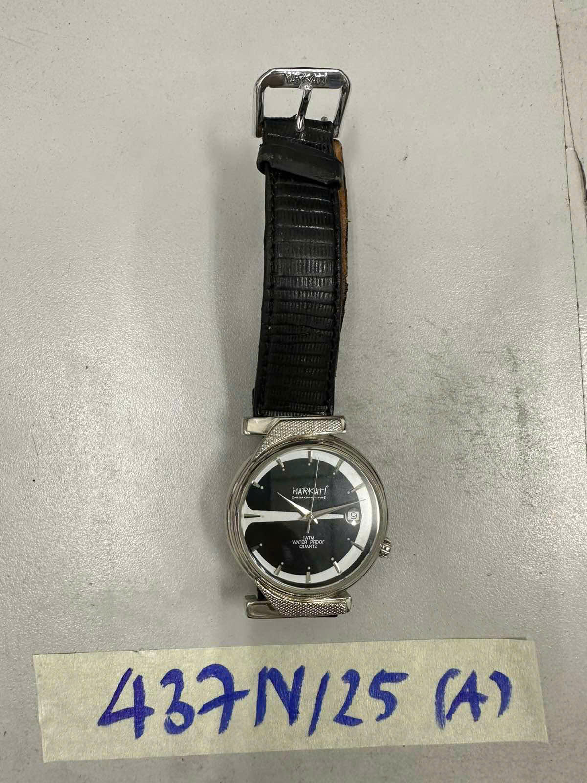 Ngày tiếp nhận: 06/03/2025 Mã hồ sơ: 437N2025A Mô tả: 01 đồng hồ kim mặt tròn, mặt đồng hồ có chữ "MARKATI DESIGNTIME", dây da màu đen. |