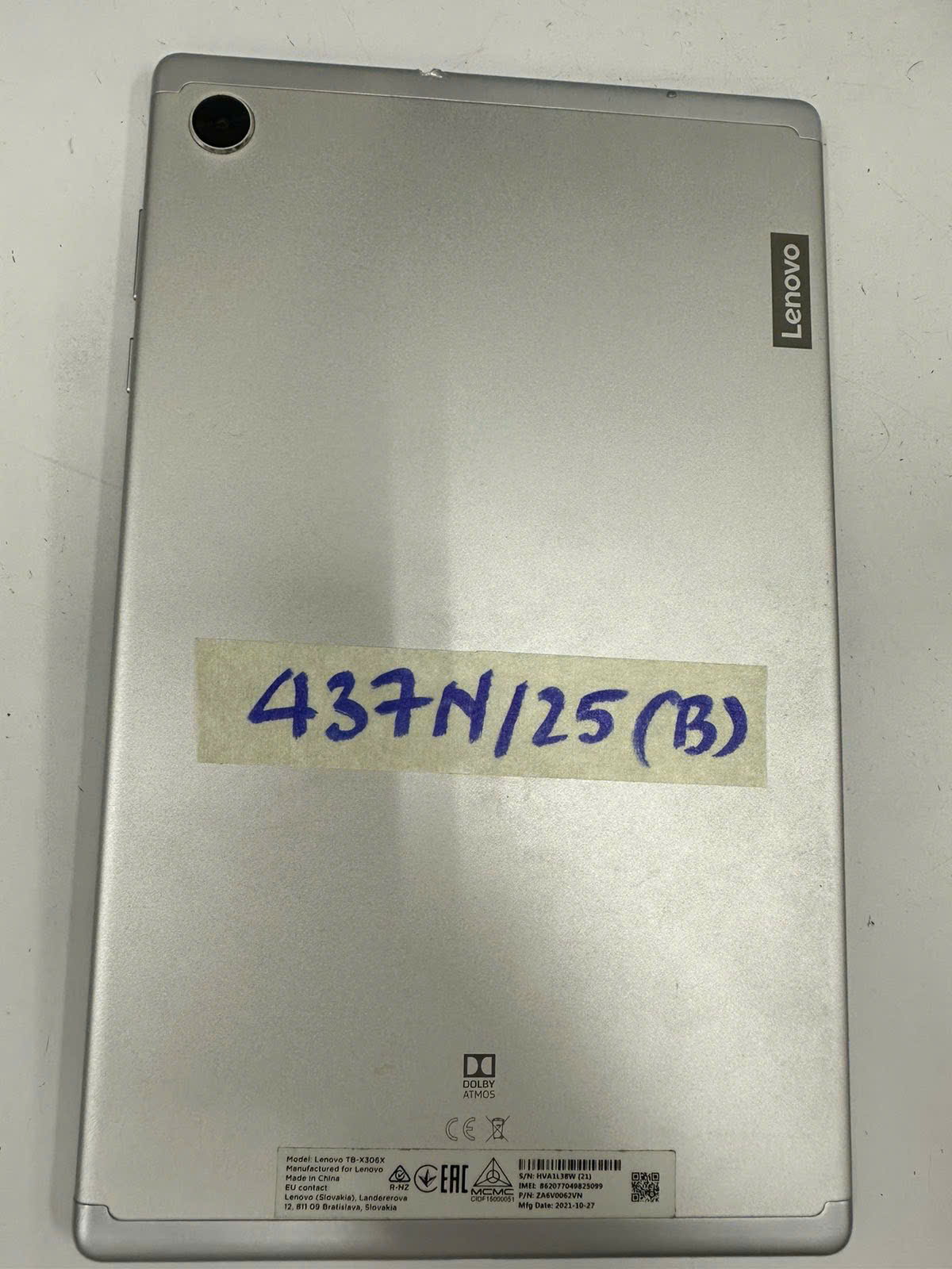 Ngày tiếp nhận: 06/03/2025 Mã hồ sơ: 437N2025B Mô tả: 01 máy tính bảng màu xám, mặt sau có chữ "LENOVO". |