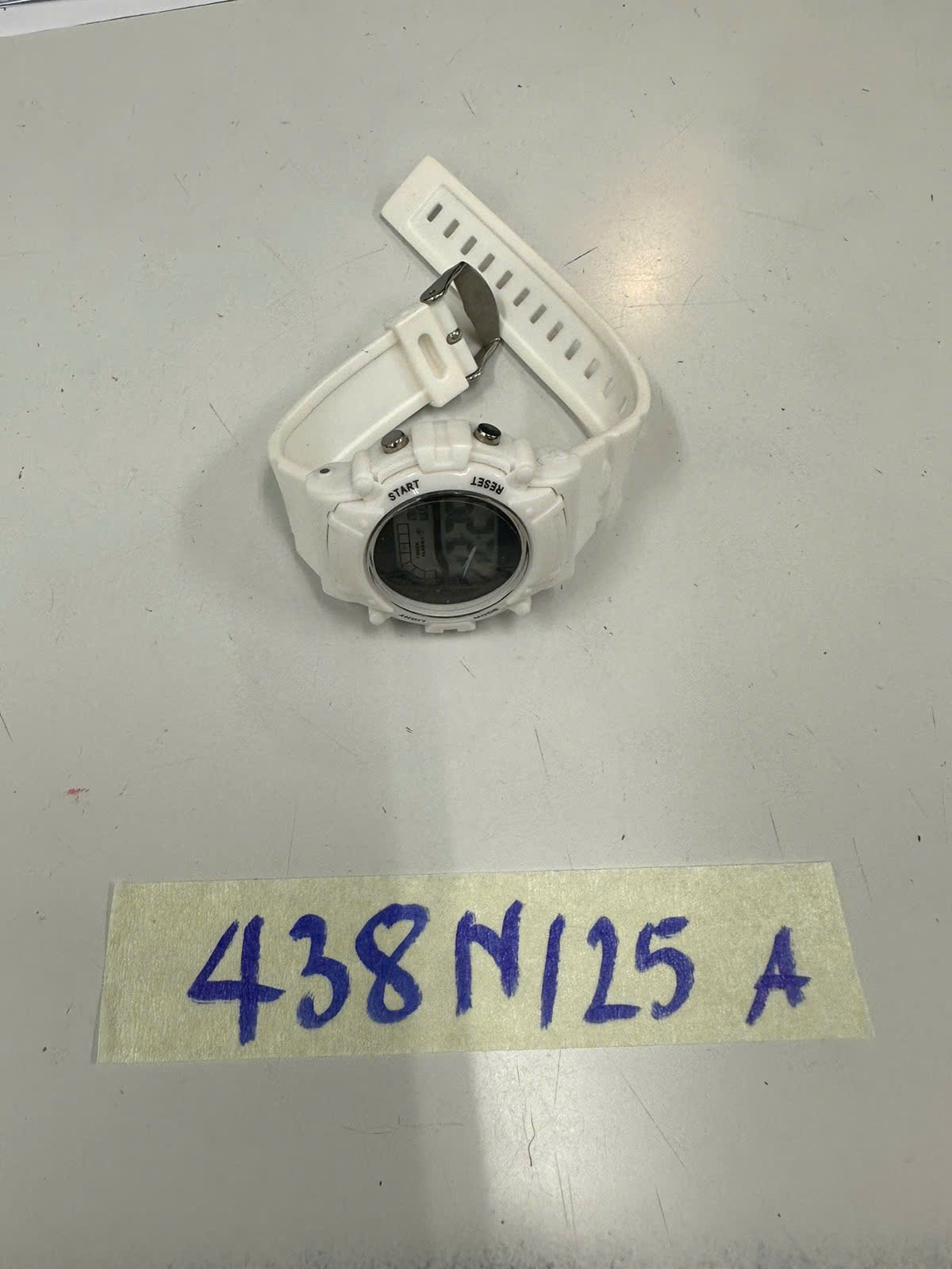 Ngày tiếp nhận: 06/03/2025 Mã hồ sơ: 438N2025A Mô tả: 01 đồng hồ điện tử mặt hình tròn màu trắng, dây đeo cao su màu trắng. |