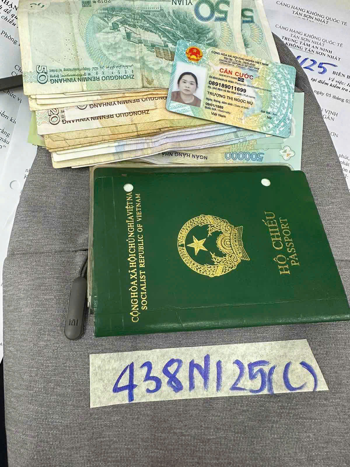 Ngày tiếp nhận: 06/03/2025 Mã hồ sơ: 438N2025C Mô tả: 01 túi nhỏ màu xám bên trong có 02 (hai) hộ chiếu đã hết hạn sử dụng mang tên Trương Thị Ngọc Nụ, 01 (một) thẻ căn cước mang tên Trương Thị Ngọc Nụ, 391 (ba trăm chín mươi mốt) nhân dân tệ Trung Quốc, 2330000 (hai triệu ba trăm ba mươi nghìn) Việt nam đồng. |