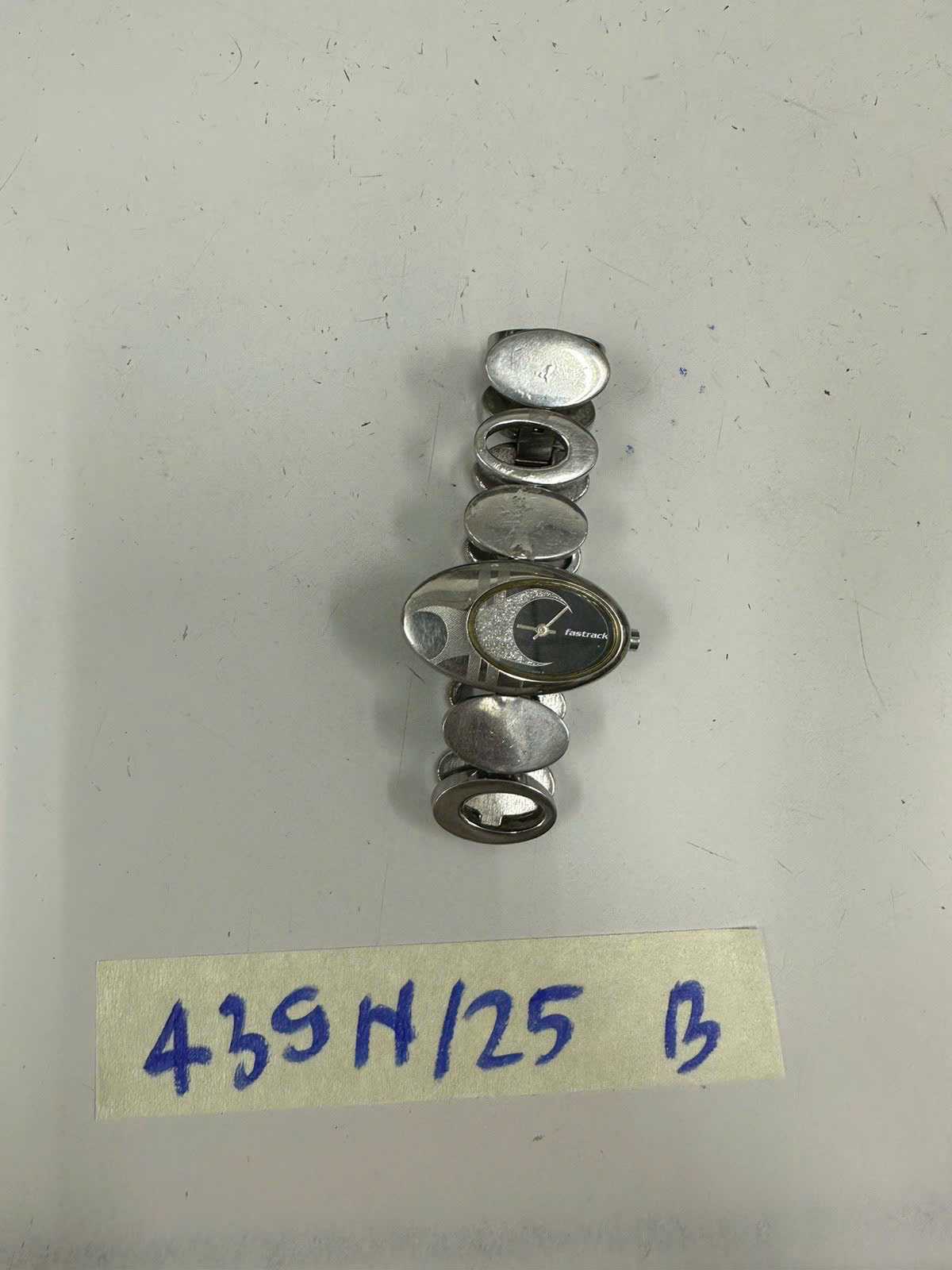 Ngày tiếp nhận: 06/03/2025 Mã hồ sơ: 439N2025B Mô tả: 01 đồng hồ hiệu “FASTRACK" mặt hình tròn màu đen, dây kim loại. |