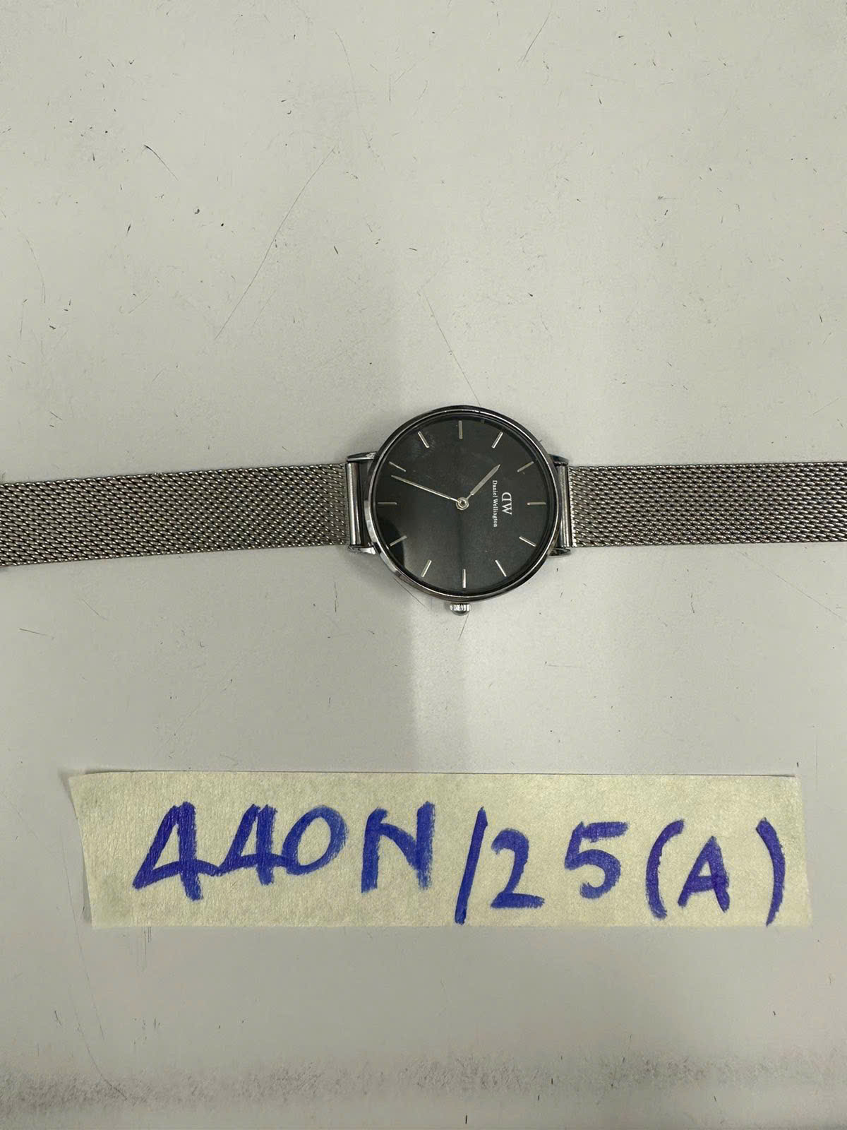 Ngày tiếp nhận: 06/03/2025 Mã hồ sơ: 440N2025A Mô tả: 01 đồng hồ bằng kim loại màu trắng, mặt đồng hồ hình tròn có logo chữ "DW Daniel Wellington". |