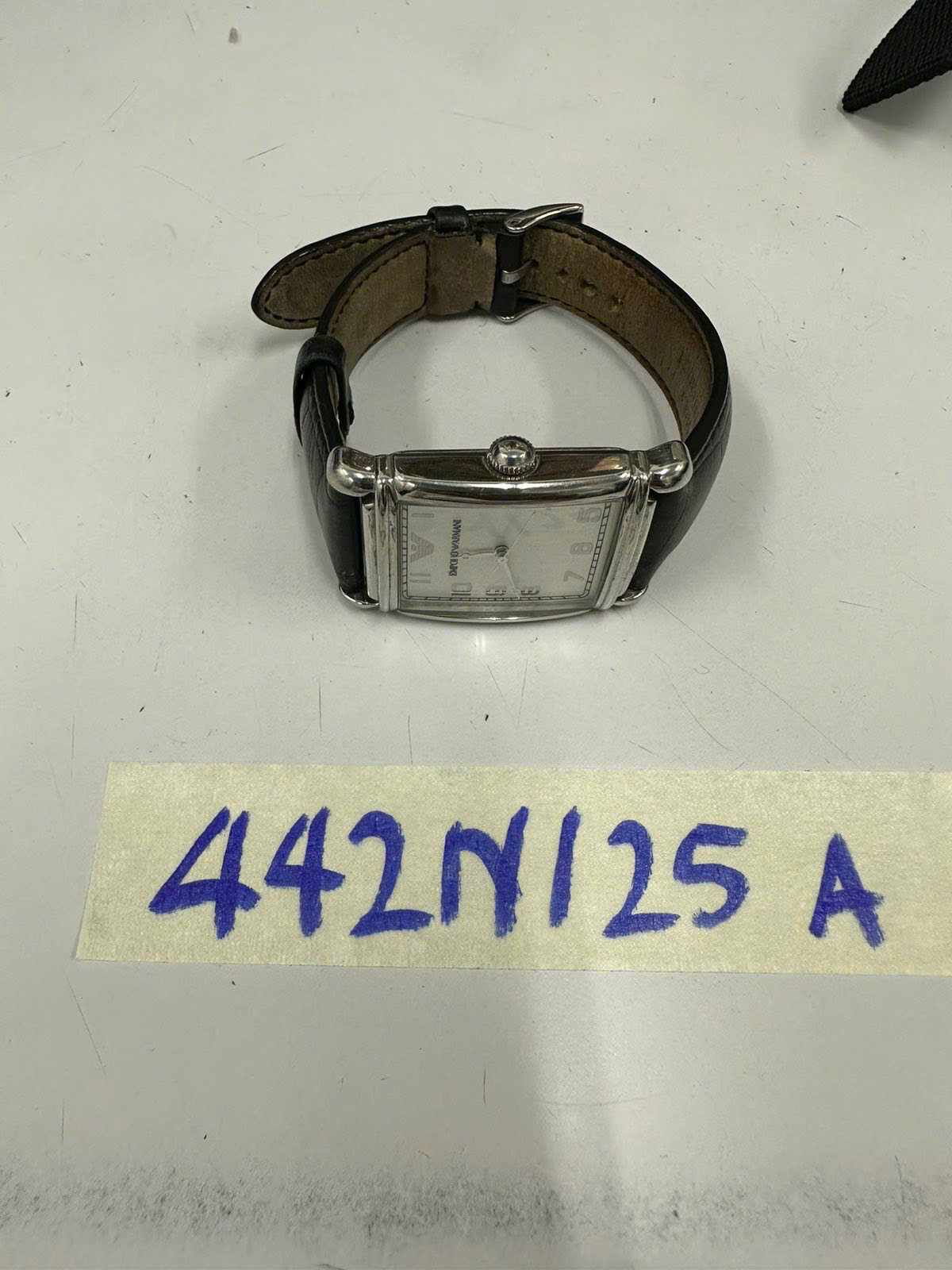 Ngày tiếp nhận: 06/03/2025 Mã hồ sơ: 442N2025A Mô tả: 01 đồng hồ màu trắng có chữ "Emporio Armani", dây da màu đen. |