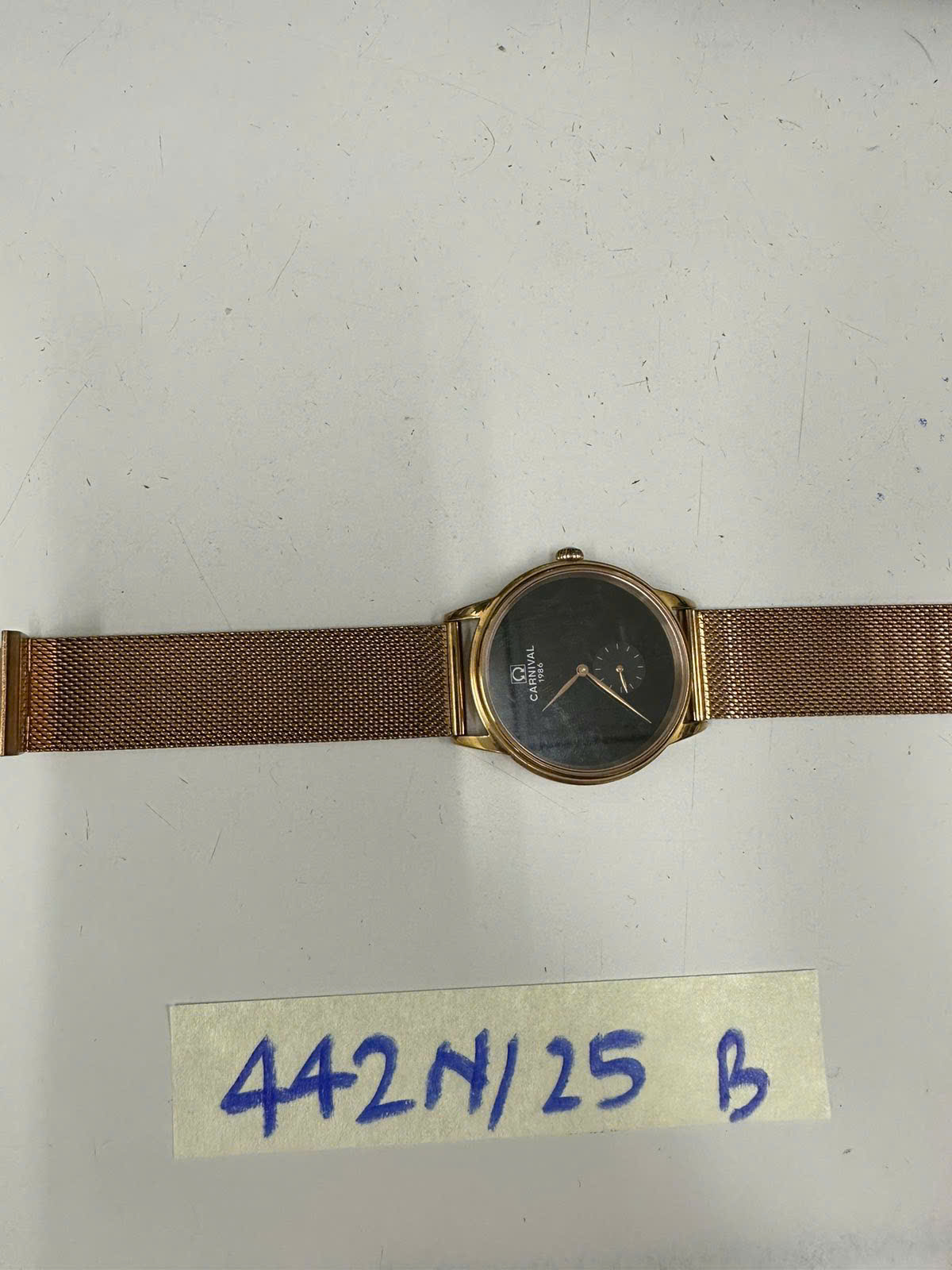 Ngày tiếp nhận: 06/03/2025 Mã hồ sơ: 442N2025B Mô tả: 01 đồng hồ màu vàng có chữ "Carnival", dây kim loại màu vàng. |