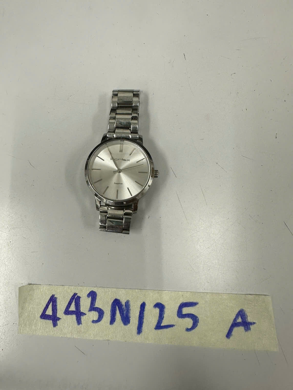 Ngày tiếp nhận: 06/03/2025 Mã hồ sơ: 443N2025A Mô tả: 01 đồng hồ trắng có chữ "KORLEX", dây kim loại màu trắng. |