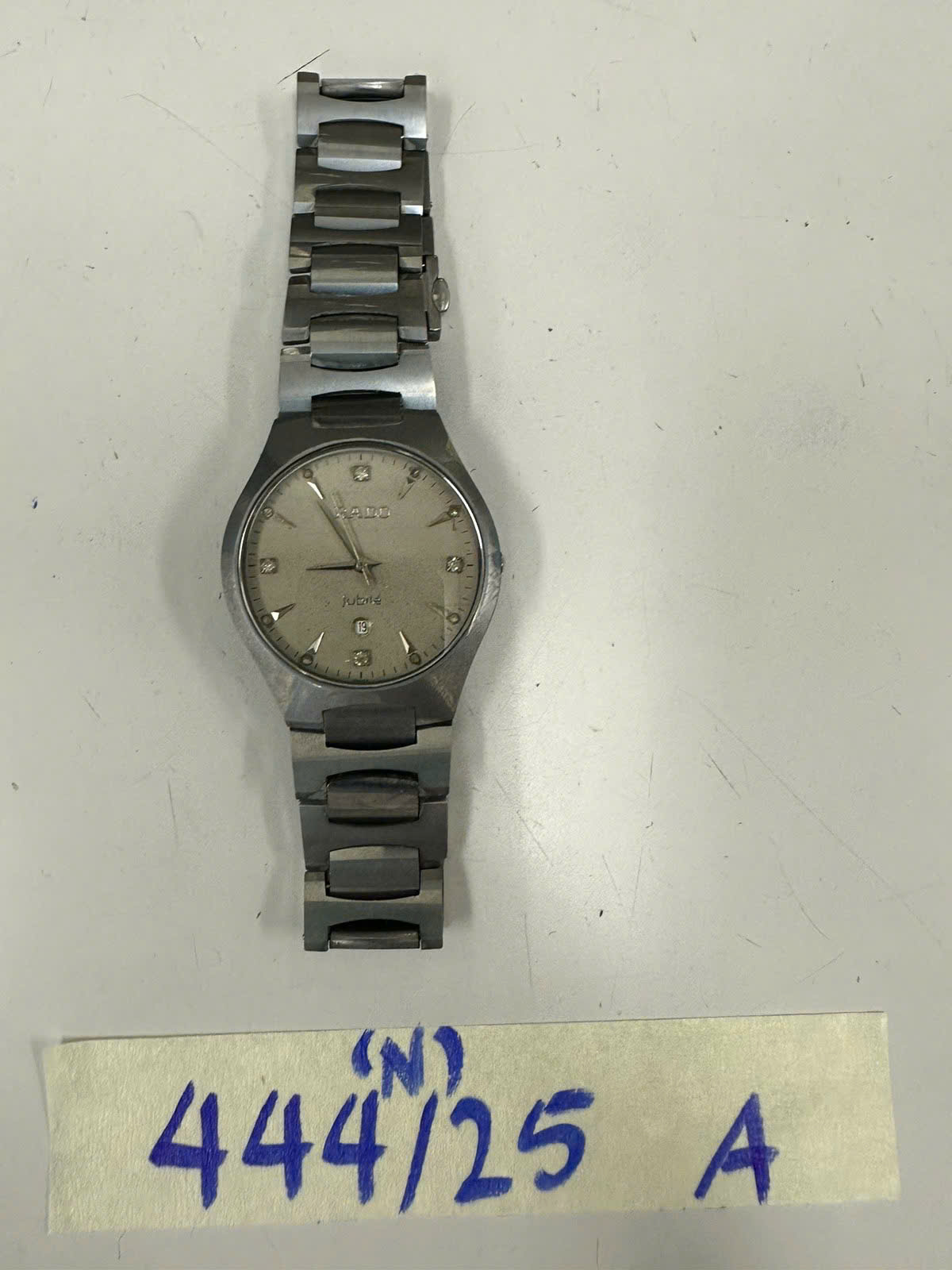 Ngày tiếp nhận: 06/03/2025 Mã hồ sơ: 444N2025A Mô tả: 01 đồng hồ kim màu xám, mặt đồng hồ tròn có chữ "RADO JUBILE", dây kim loại mau xám. |