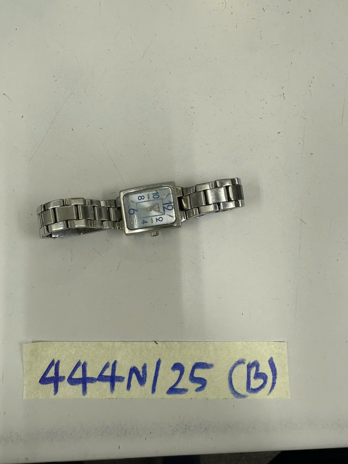 Ngày tiếp nhận: 06/03/2025 Mã hồ sơ: 444N2025B Mô tả: 01 đồng hồ kim màu bạc, mặt đồng chữ nhật có chữ "CASIO", dây kim loại màu bạc. |