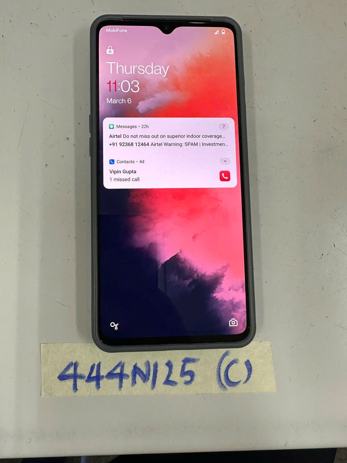 Ngày tiếp nhận: 06/03/2025 Mã hồ sơ: 444N2025C Mô tả: 01 điện thoại có logo "ONEPLUS" màu xanh dương ốp xám. |
