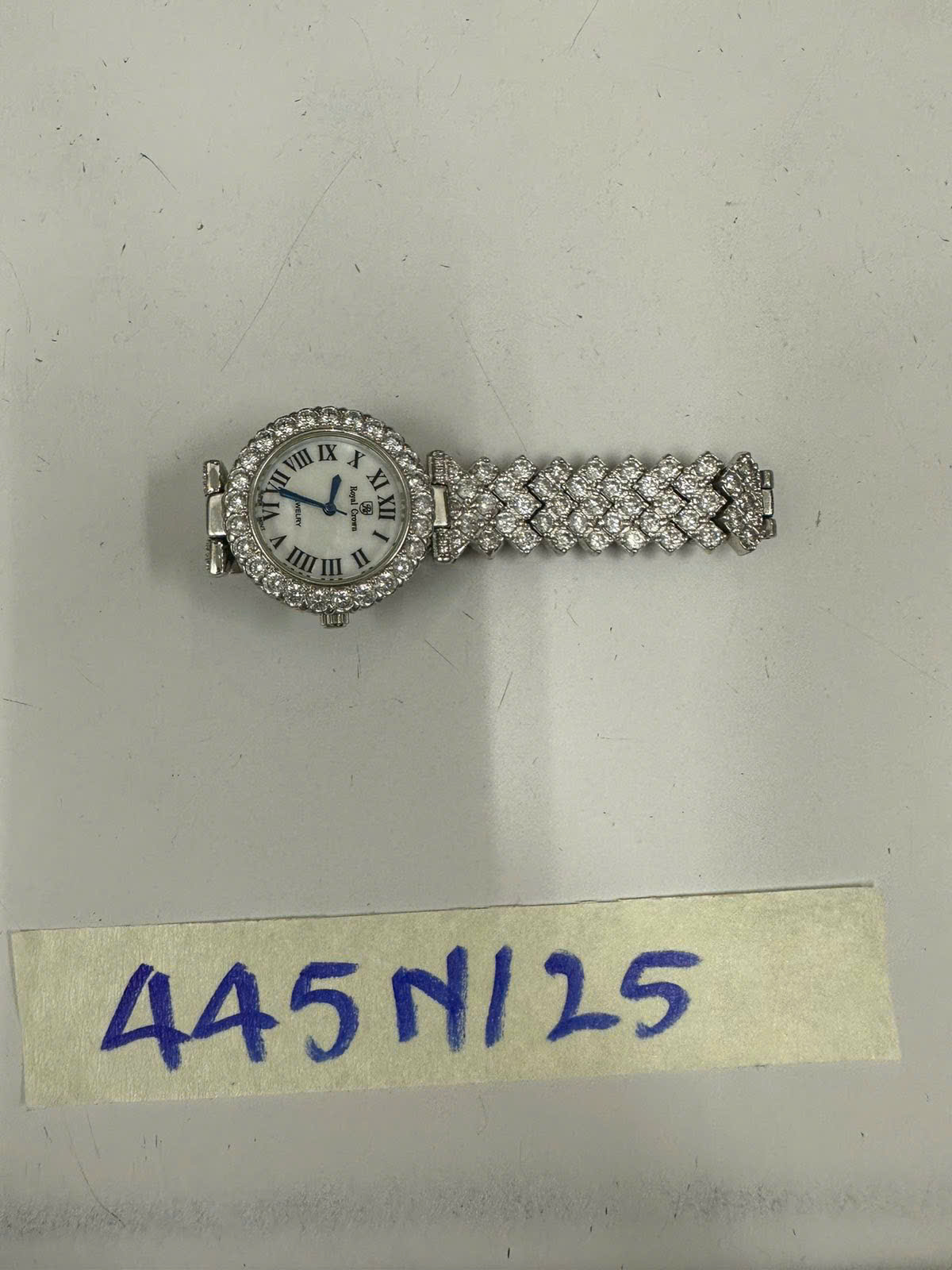 Ngày tiếp nhận: 06/03/2025 Mã hồ sơ: 445N2025 Mô tả: 01 đồng hồ có chữ ROYAL CROWN mặt màu trắng có đính đá kim loại màu trắng. |