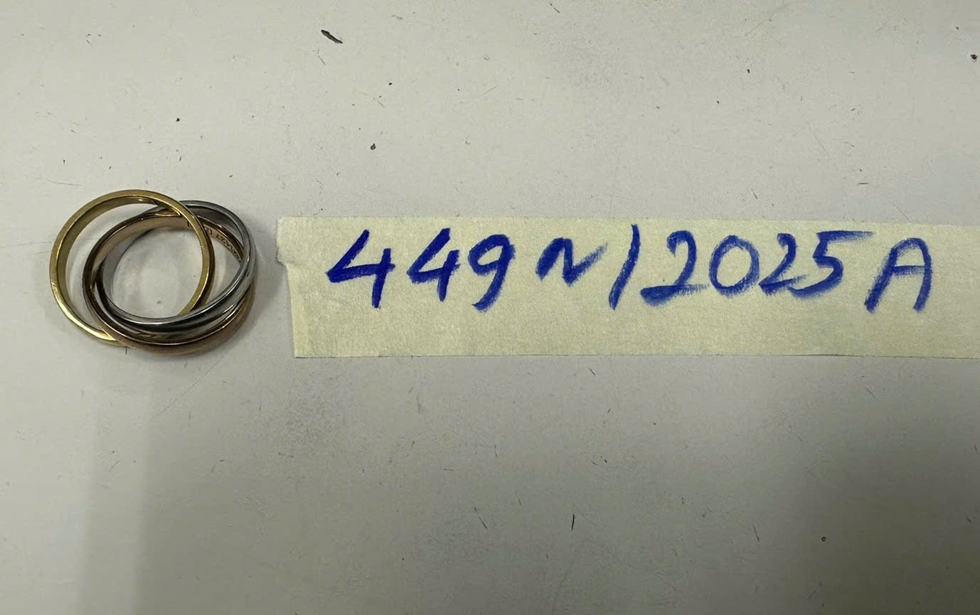 Ngày tiếp nhận: 06/03/2025 Mã hồ sơ: 449N2025A Mô tả: 03 Nhẫn kim loại gắn liền với nhau, bao gồm: + 01 nhẫn kim loại có màu trắng, + 01 nhẫn kim loại có màu vàng + 01 nhẫn kim loại có màu đồng và có chữ "Cartier". |