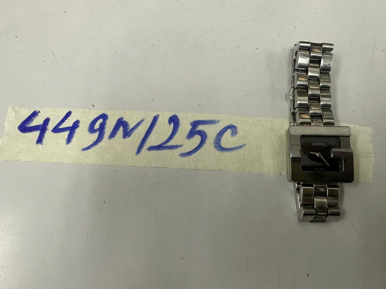 Ngày tiếp nhận: 06/03/2025 Mã hồ sơ: 449N2025C Mô tả: 01 Đồng hồ kim loại màu trắng của nữ, mặt vuông, có chữ "Gucci". |