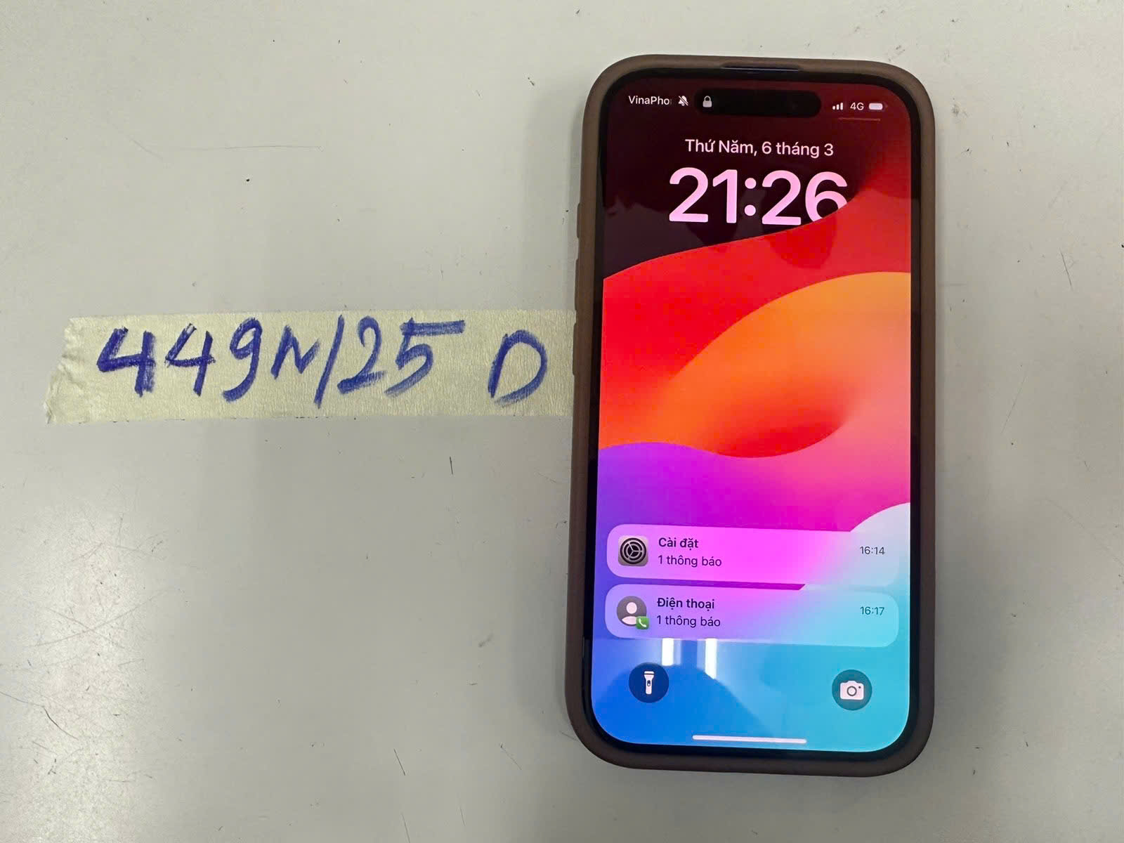 Ngày tiếp nhận: 06/03/2025 Mã hồ sơ: 449N2025D Mô tả: 01 Điện thoại màu xanh nhạt, có chữ "Iphone", có ốp lưng viền màu nâu.. |