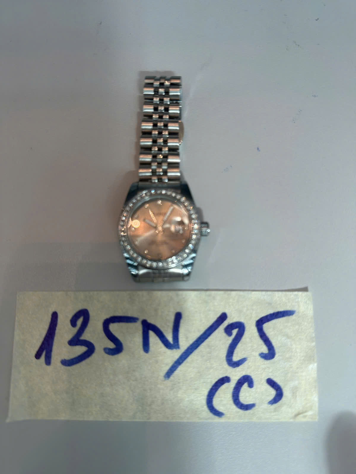 Ngày tiếp nhận: 16/12/2025 Mã hồ sơ: 135N2025C Mô tả: 01 đồng hồ kim loại có viền đính đá màu trắng có chữ Trance. |