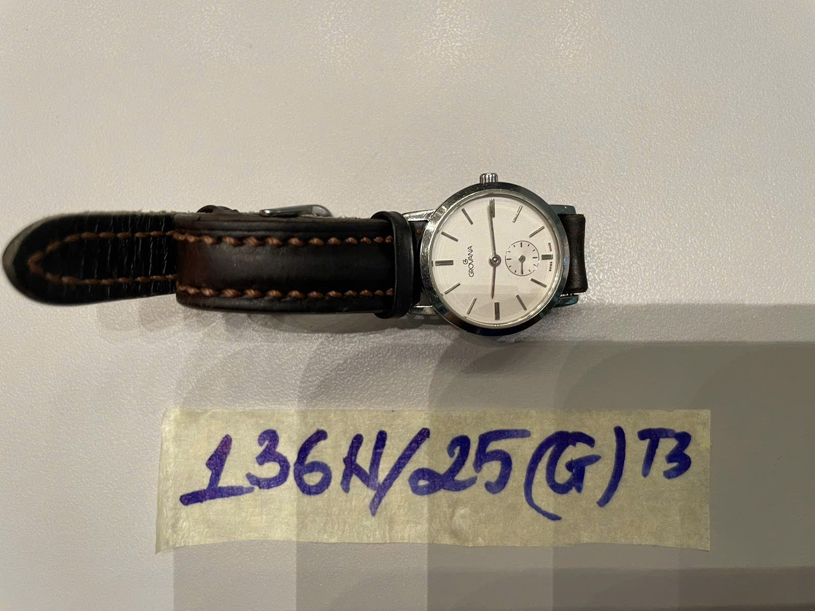 Ngày tiếp nhận: 16/12/2025 Mã hồ sơ: 136N2025G Mô tả: 01 đồng hồ dây màu đen có chữ Grovana. |