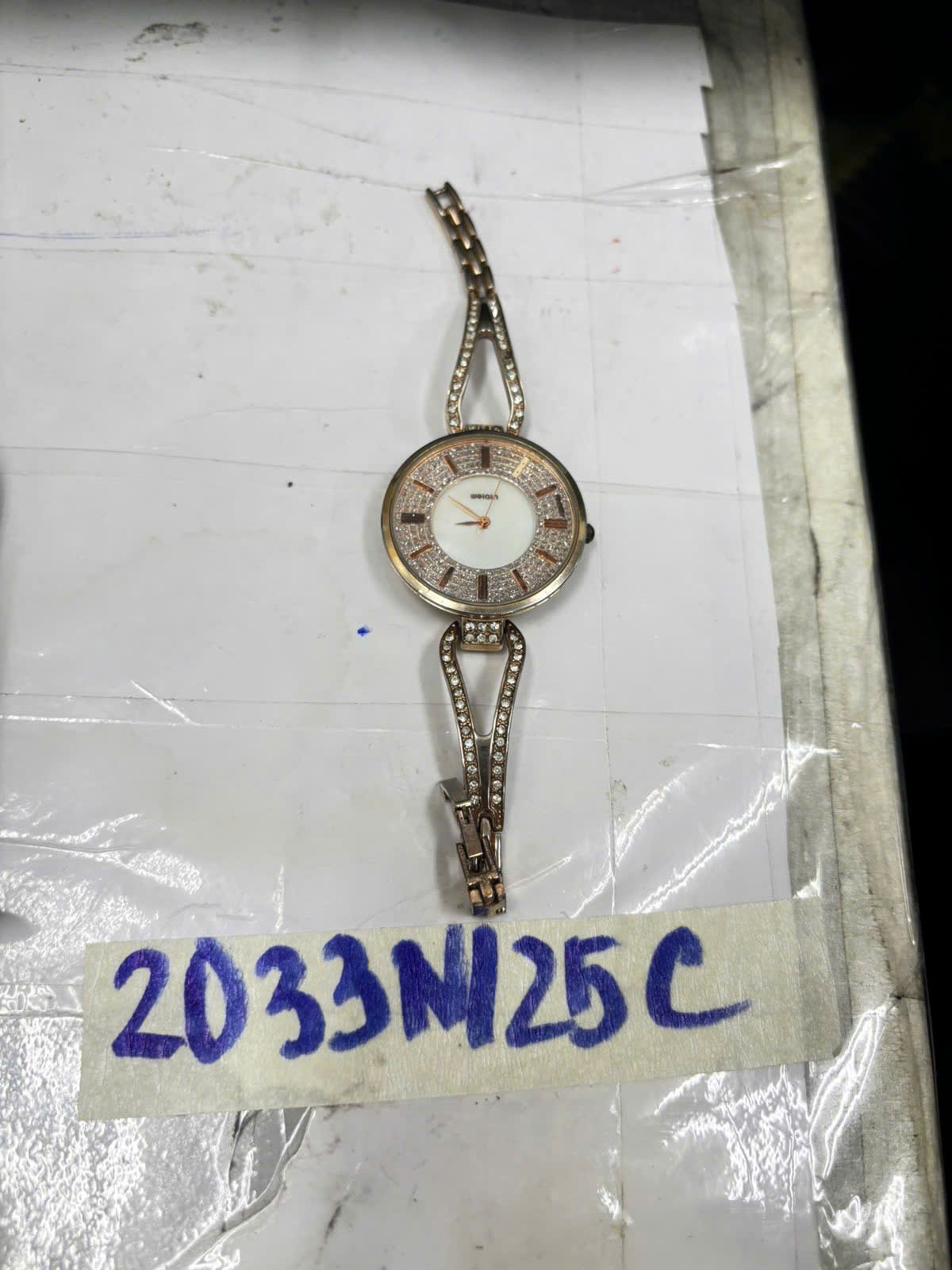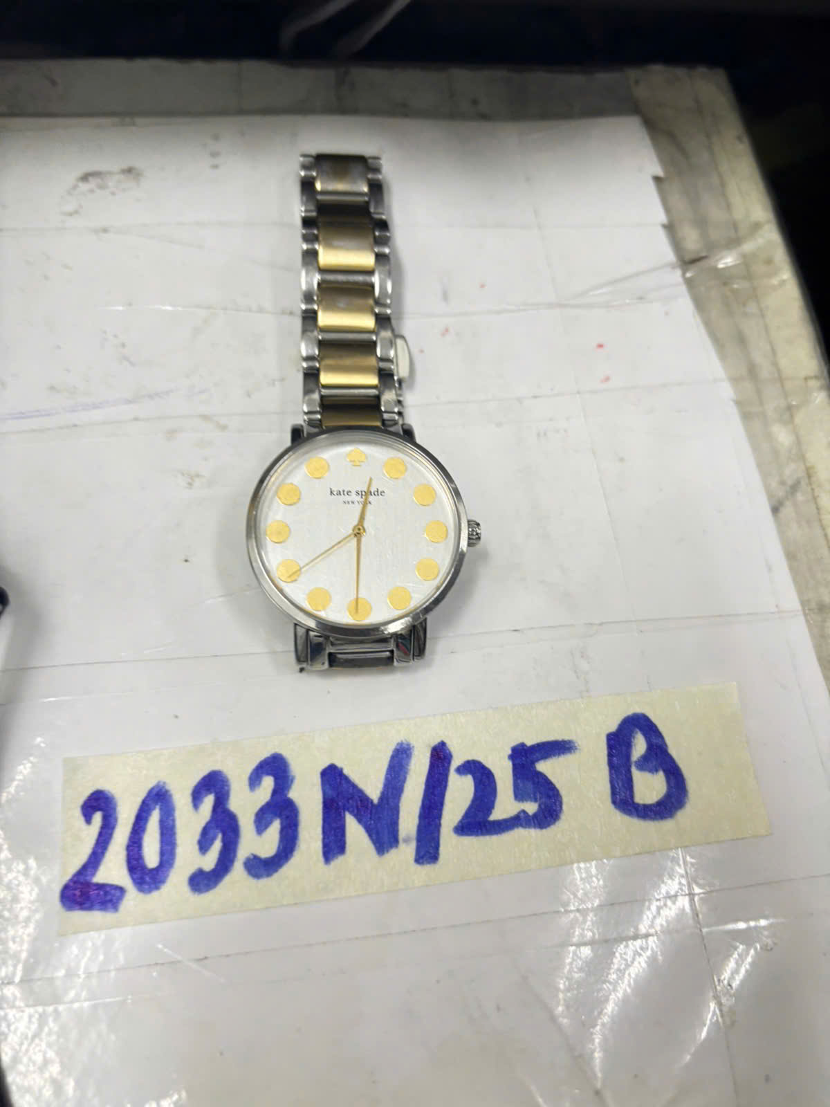 Ngày tiếp nhận: 19/11/2025 Mã hồ sơ: 2033N2025B Mô tả: 01 đồng hồ đeo tay bằng kim loại màu trắng sọc vàng, mặt hình tròn có logo chữ "Kate Spade". |