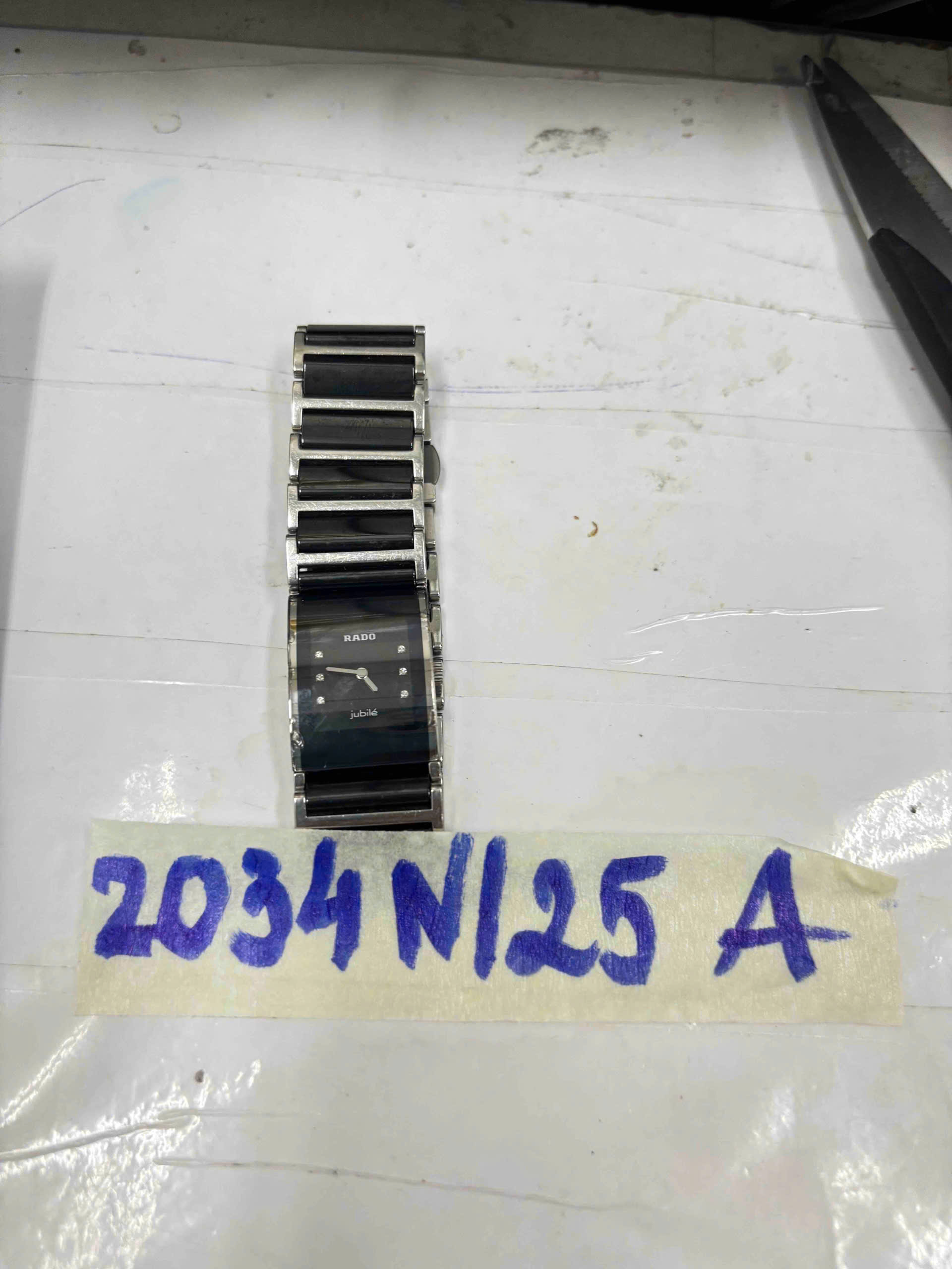 Ngày tiếp nhận: 19/11/2025 Mã hồ sơ: 2034N2025A Mô tả: 01 đồng hồ bằng kim loại màu đen, mặt hình chữ nhật có chữ "RADO", dây đeo màu đen bằng kim loại. |