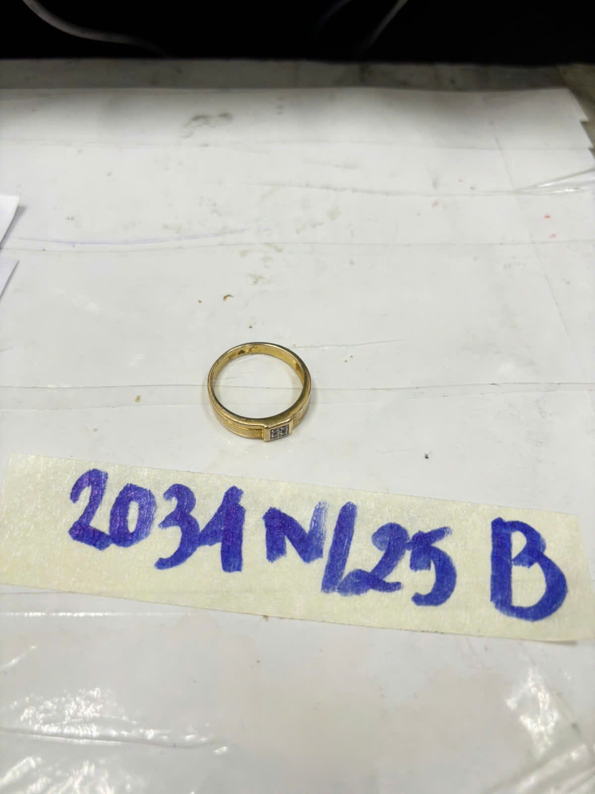 Ngày tiếp nhận: 19/11/2025 Mã hồ sơ: 2034N2025B Mô tả: 01 nhẫn kim loại màu vàng không rõ hiệu, mặt nhẫn có đính hạt. |