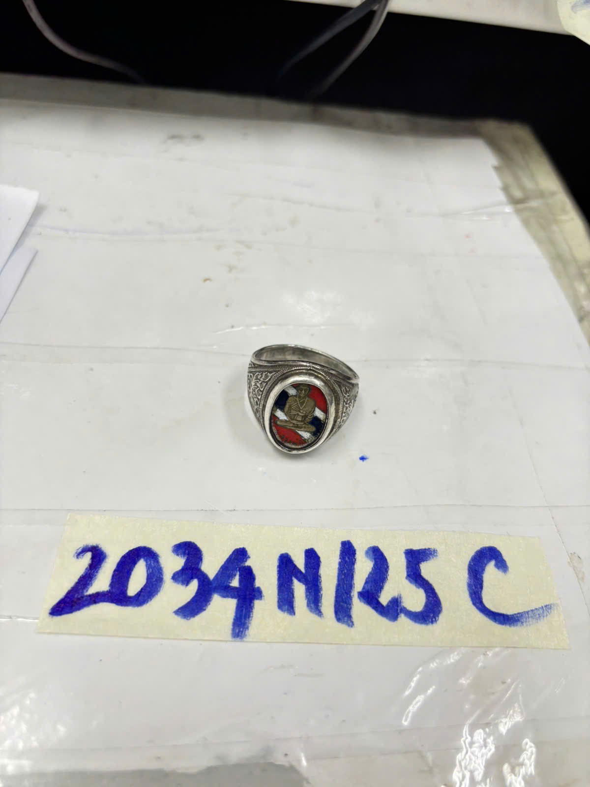 Ngày tiếp nhận: 19/11/2025 Mã hồ sơ: 2034N2025C Mô tả: 01 nhẫn kim loại màu bạc, mặt nhẫn có hình phật. |