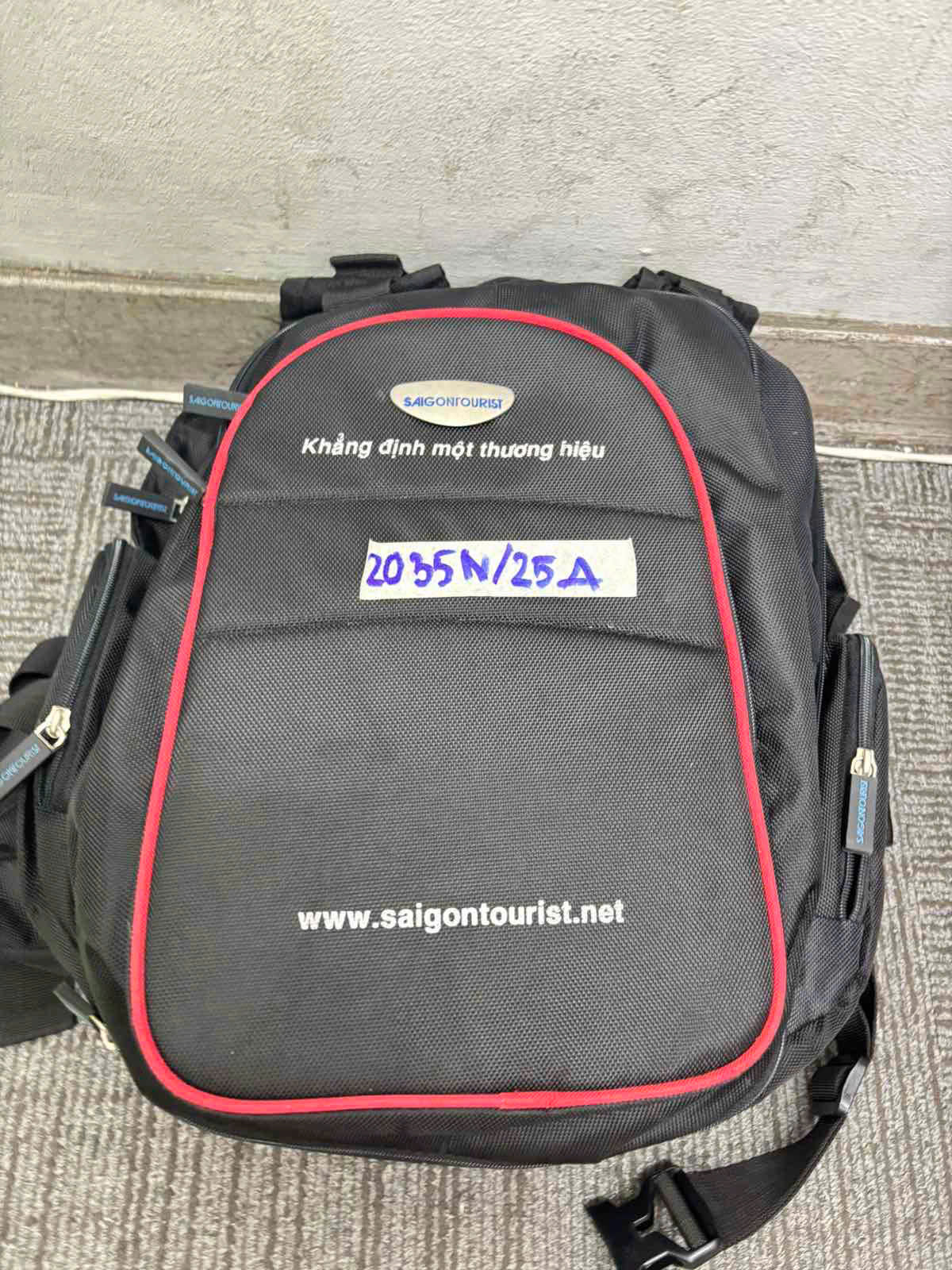 Ngày tiếp nhận: 19/11/2025 Mã hồ sơ: 2035N2025A Mô tả: 01 balo bằng vải màu đen có logo chữ "SAIGON TOURIST", bên trong gồm một số đồ dùng trang điểm và vật dụng cá nhân, 01 cặp mắt kính có tròng hình chữ nhật màu nâu không rõ thương hiệu đựng trong ví có logo chữ "SUSSAN". |