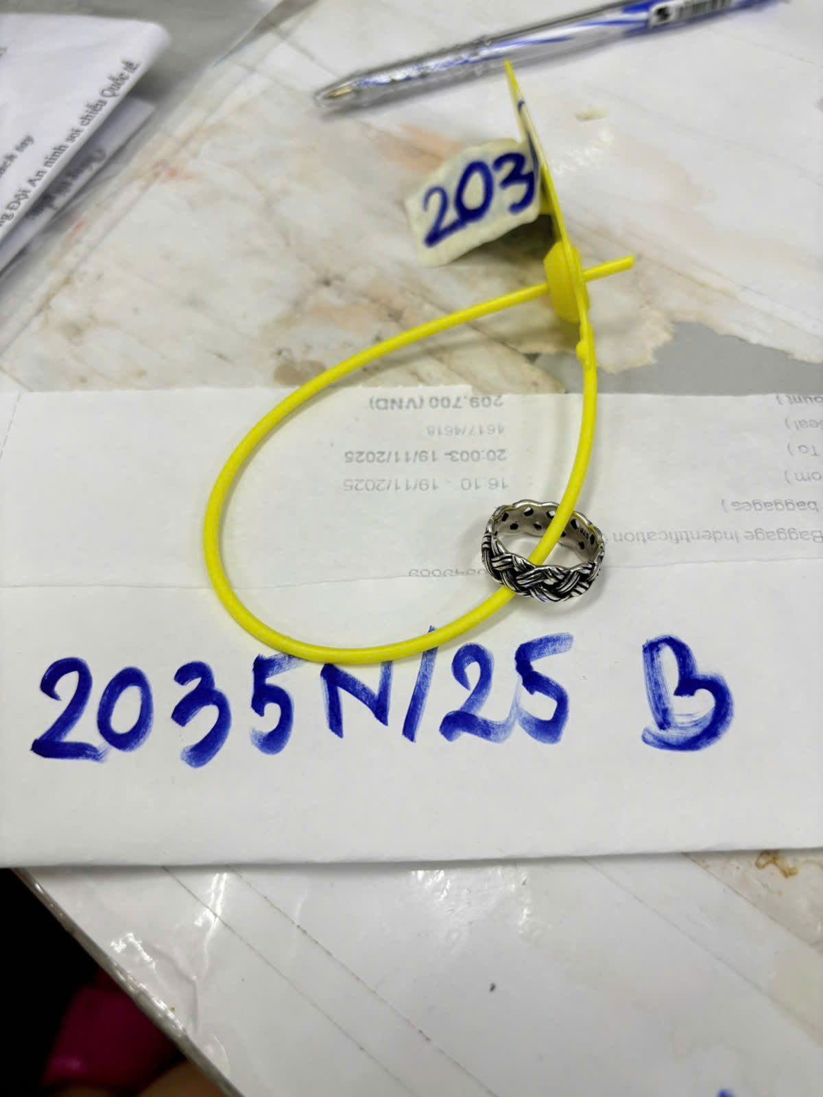 Ngày tiếp nhận: 19/11/2025 Mã hồ sơ: 2035N2025B Mô tả: 01 nhẫn bằng kim loại màu trắng. |