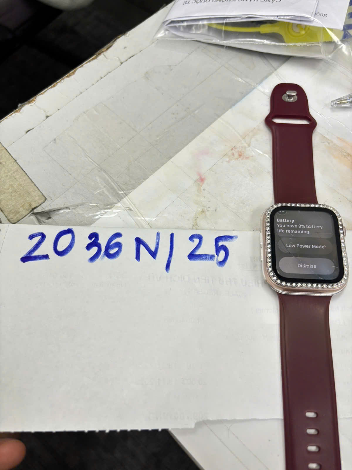 Ngày tiếp nhận: 19/11/2025 Mã hồ sơ: 2036N2025 Mô tả: 01 đồng hồ thông minh "Apple Watch Series 5" trên mặt có ốp đính đá, dây cao su màu nâu. |