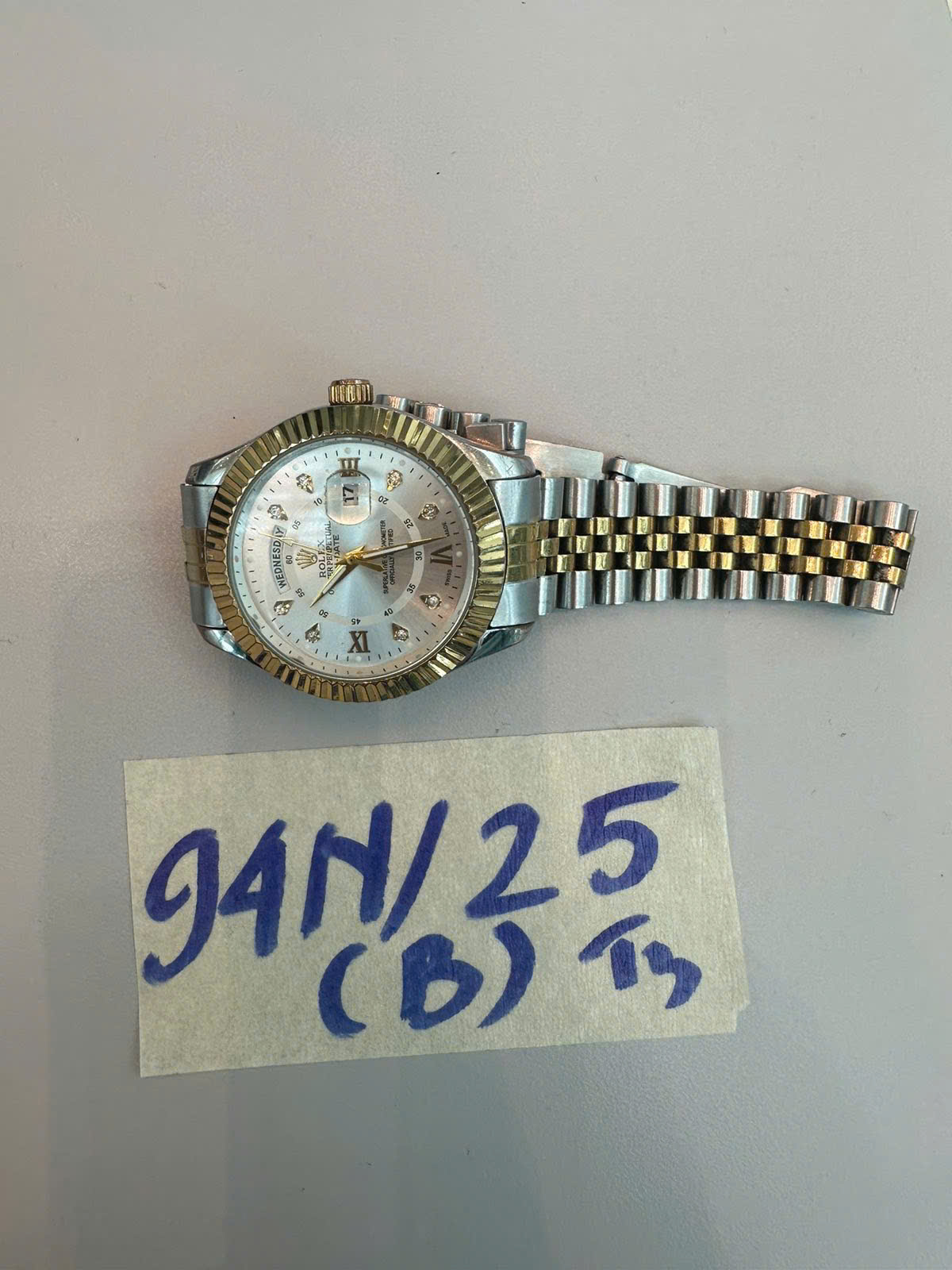 Ngày tiếp nhận: 19/11/2025 Mã hồ sơ: 94N2025B Mô tả: 01 đồng hồ kim loại có màu vàng và bạc, có chữ "ROLEX". |