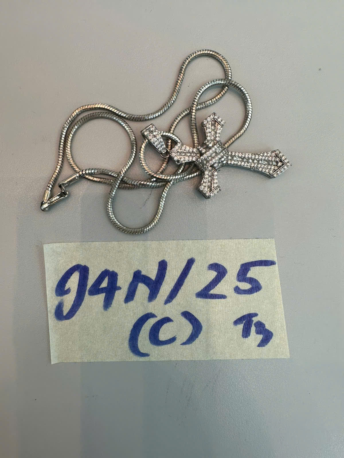 Ngày tiếp nhận: 19/11/2025 Mã hồ sơ: 94N2025C Mô tả: 01 sợi dây chuyền màu trắng có mặt dây thánh giá. |