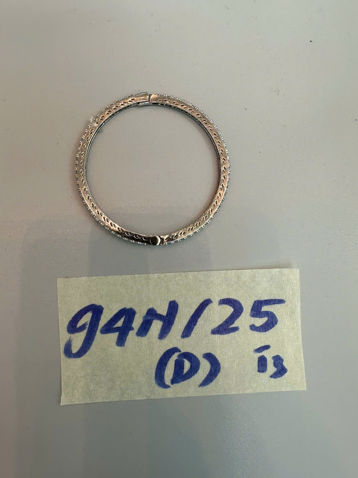 Ngày tiếp nhận: 19/11/2025 Mã hồ sơ: 94N2025D Mô tả: 01 chiếc vòng kim loại màu trắng có gắn hạt. |