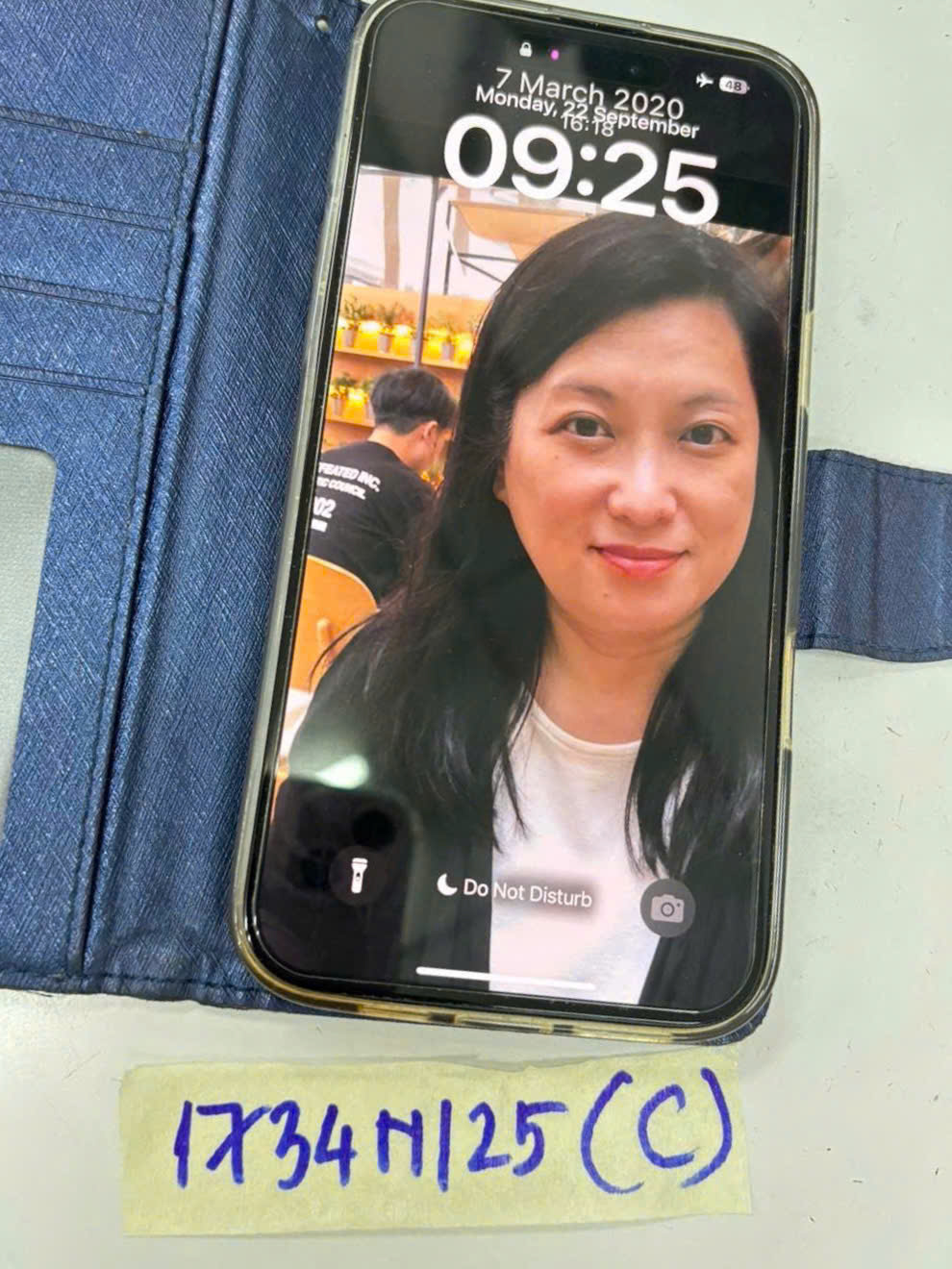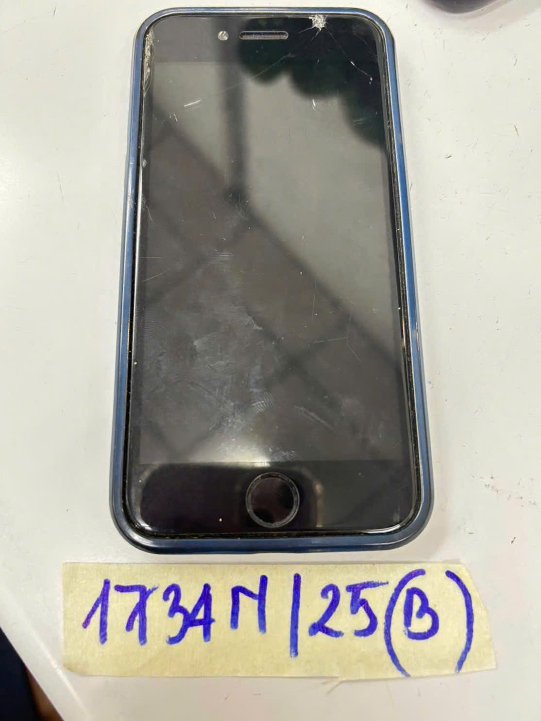 Ngày tiếp nhận: 22/9/2025 Mã hồ sơ: 1734N2025B Mô tả: 01 điện thoại trắng Apple Iphone ốp lưng giống da màu xanh đậm chữ XIEKE. |