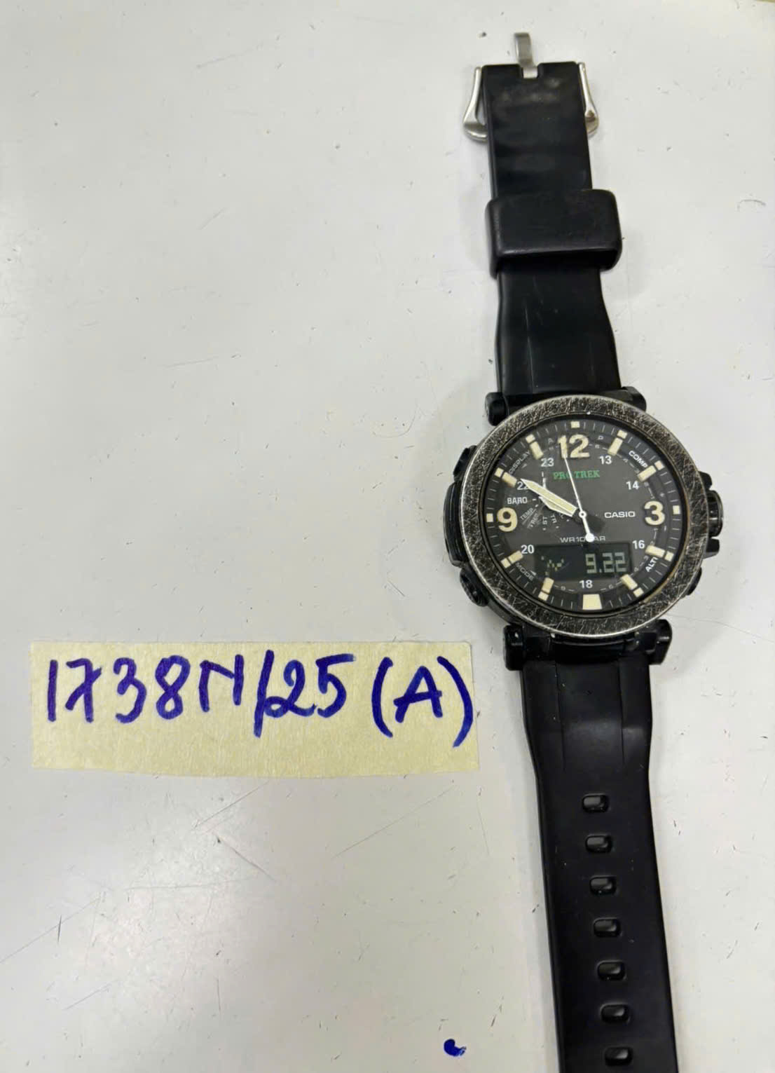 Ngày tiếp nhận: 22/9/2025 Mã hồ sơ: 1738N2025A Mô tả: 01 đồng hồ kim bằng KL mặt tròn màu đen chữ PRO TREK dây nhựa đen. |
