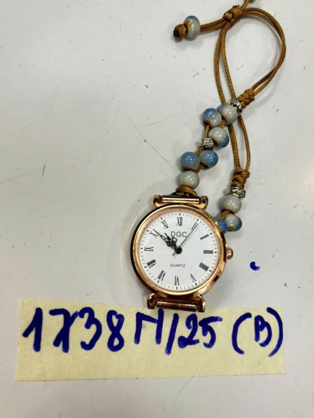 Ngày tiếp nhận: 22/9/2025 Mã hồ sơ: 1738N2025B Mô tả: 01 đồng hồ kim bằng KL mặt tròn màu vàng chữ DGC dây chỉ màu vàng. |