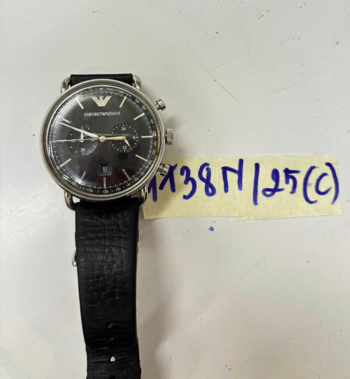 Ngày tiếp nhận: 22/9/2025 Mã hồ sơ: 1738N2025C Mô tả: 01 đồng hồ kim bằng KL mặt tròn màu bạc chữ EMPORIO ARMANI, dây da đen. |
