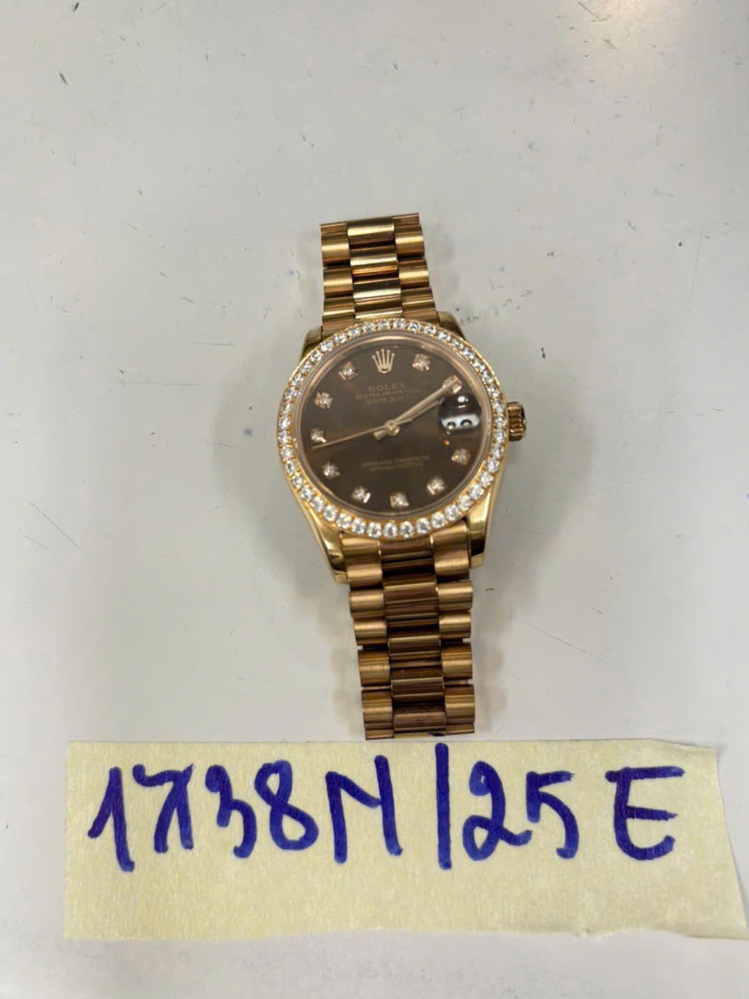Ngày tiếp nhận: 22/9/2025 Mã hồ sơ: 1738N2025E Mô tả: 01 đồng hồ kim bằng KL mặt tròn màu vàng chữ ROLEX dây kim loại màu vàng. |