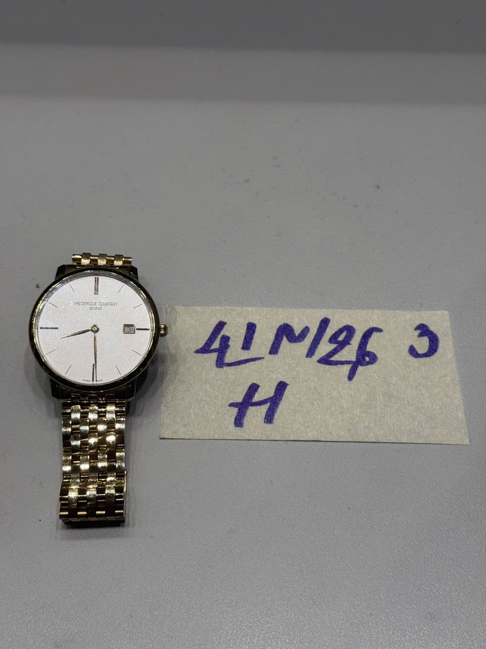 Ngày tiếp nhận: 31/01/2026 Mã hồ sơ: 41N2026H-T3 Mô tả: 01 đồng hồ mặt tròn, dây kim loại màu vàng,có chữ FREDERIQUE CONSTANT. |