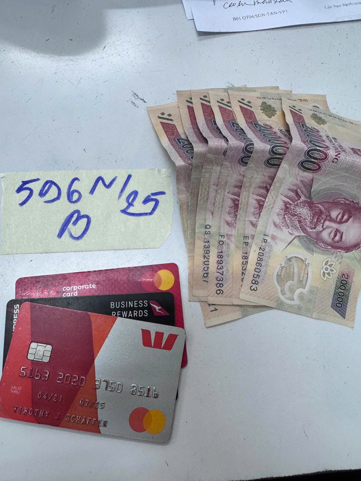 Ngày tiếp nhận: 03/4/2025 Mã hồ sơ: 596N2025B Mô tả: 01 hay đồ gồm: 1.200.000 VNĐ, 03 (ba) thẻ nhựa mang tên TIMOTHY J SCHAFFER". |
