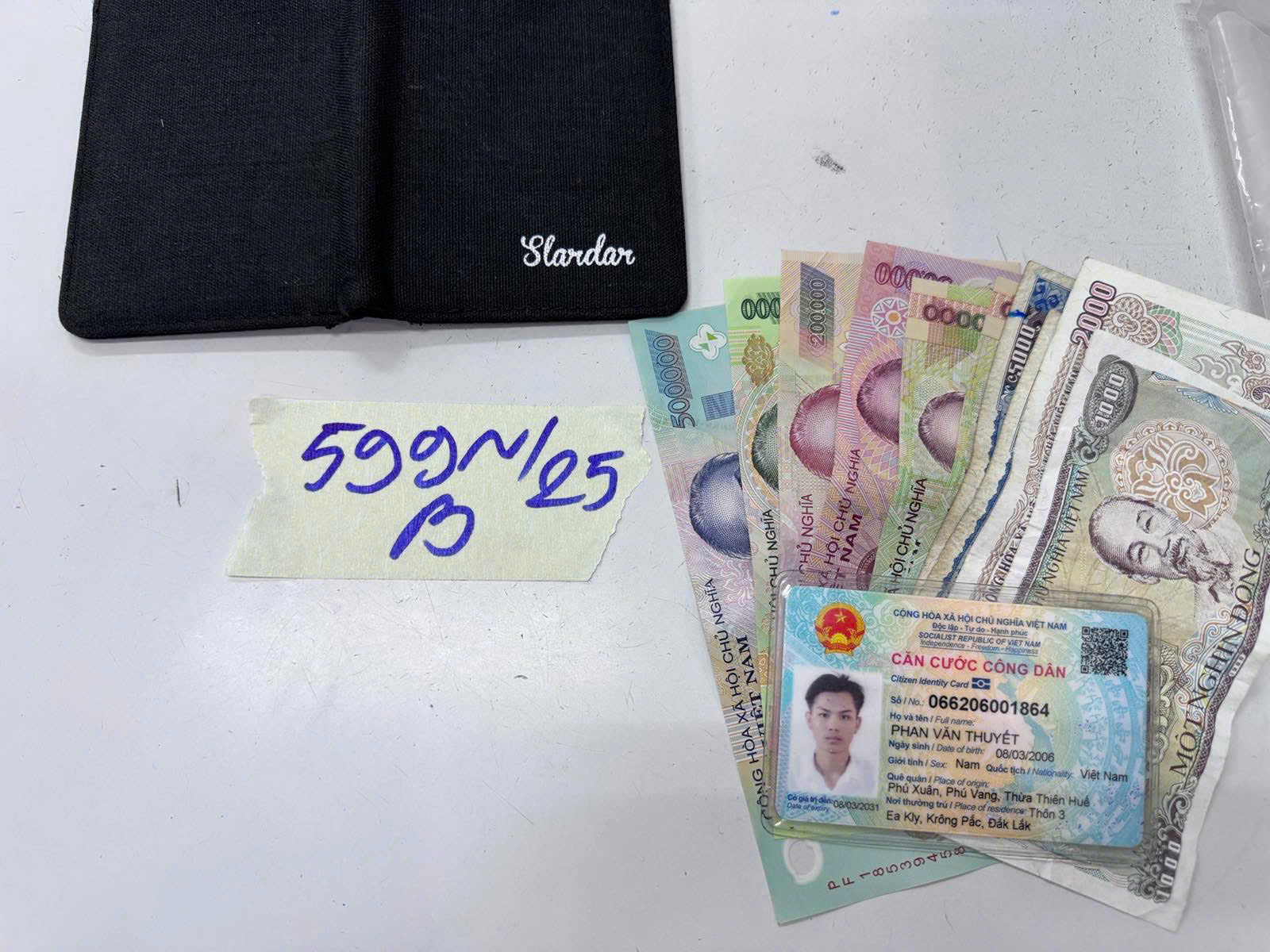 Ngày tiếp nhận: 03/4/2025 Mã hồ sơ: 599N2025B Mô tả: 01 ví vải màu đen, trên ví có chữ "SLARDAR", bên trong ví có :01 (một) thẻ CCCD mang lên PHAN VĂN THUYẾT, 01 (một) thẻ VISA Platinum VPBank cùng tên và 883.000VND. |