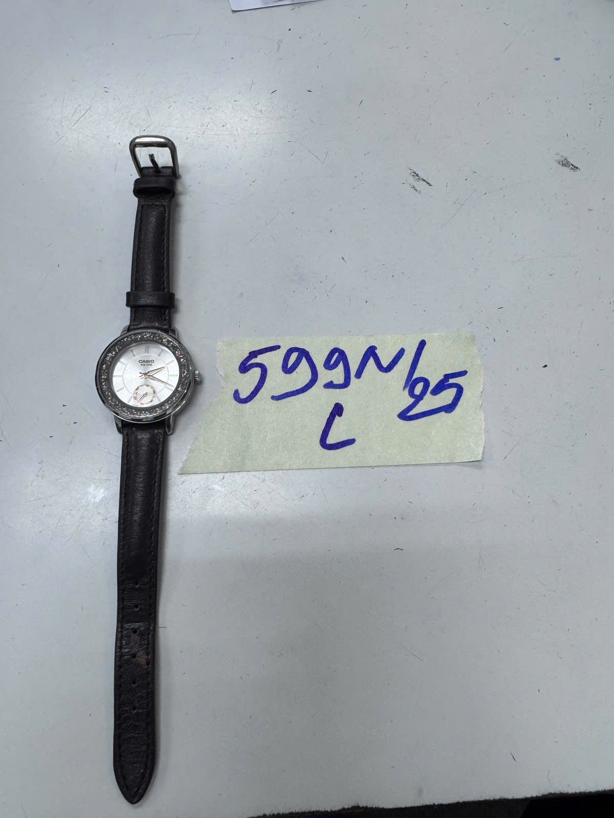 Ngày tiếp nhận: 03/4/2025 Mã hồ sơ: 599N2025C Mô tả: 01 đồng hồ kim mặt tròn màu bạc, dây da màu nâu, mặt dồng hồ có chữ "CASIO". |