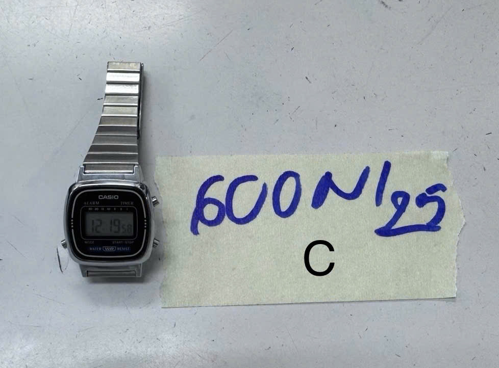 Ngày tiếp nhận: 03/4/2025 Mã hồ sơ: 600N2025C Mô tả: 01 đồng hồ điện từ bằng kim loại màu trắng có chữ "CASIO". |