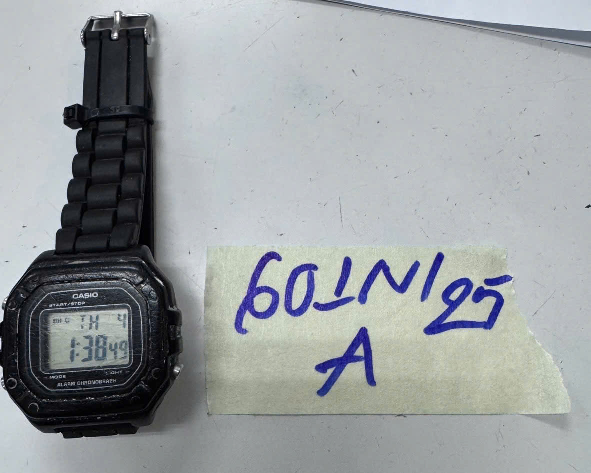 Ngày tiếp nhận: 03/4/2025 Mã hồ sơ: 601N2025A Mô tả: 01 đồng hồ đeo tay bằng nhựa màu đen, mặt đồng hồ hình tròn có logo chữ “CASIO". |