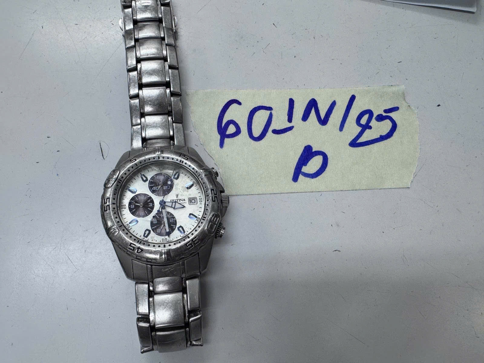 Ngày tiếp nhận: 03/4/2025 Mã hồ sơ: 601N2025B Mô tả: 01 đồng hồ đeo tay bằng kim loại màu trắng, mặt đồng hồ hình tròn logo chữ FESTINA. |