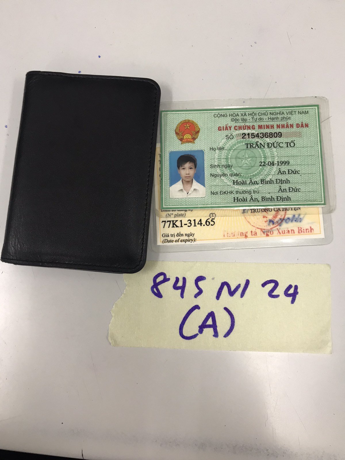Ngày tiếp nhận: 01/6/2024 Mã hồ sơ: 845N2024A Mô tả: 01 ví cầm tay nhỏ có CMND và GPLX mang tên "Trần Đức Tố". |