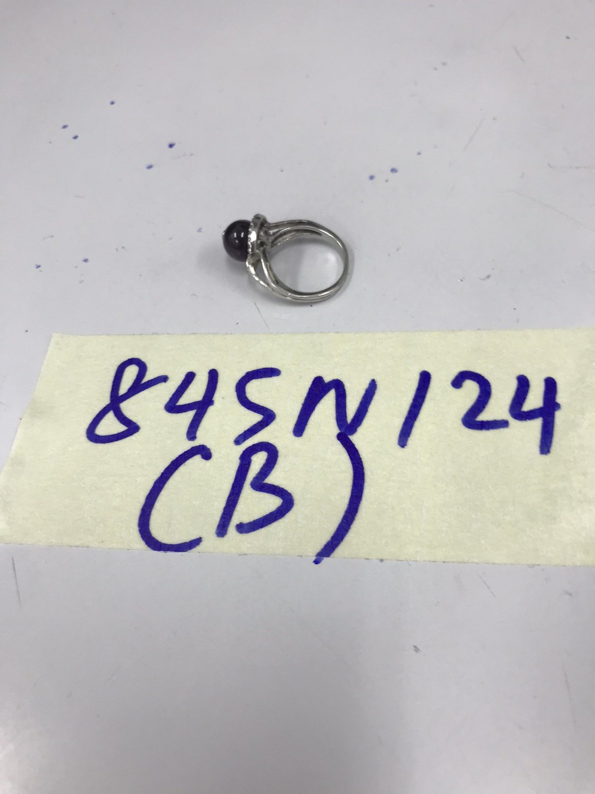 Ngày tiếp nhận: 01/6/2024 Mã hồ sơ: 845N2024B Mô tả: 01 Nhẫn kim loại màu trắng có hột màu đen. |