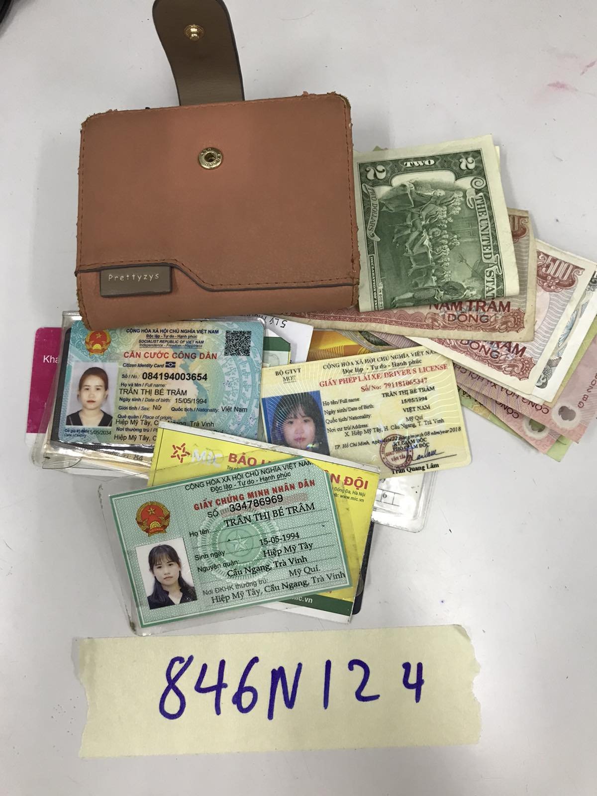 Ngày tiếp nhận: 02/6/2024 Mã hồ sơ: 846N2024 Mô tả: 01 ví da màu nâu bên trong có CCCD, GPLX A1, thẻ ngân hàng tên TRẦN THỊ BÉ TRÂM, 367,000 VNĐ và 02 USD, 01 nhẫn nữ trang bằng kim loại màu trắng đính hạt màu trắng. |