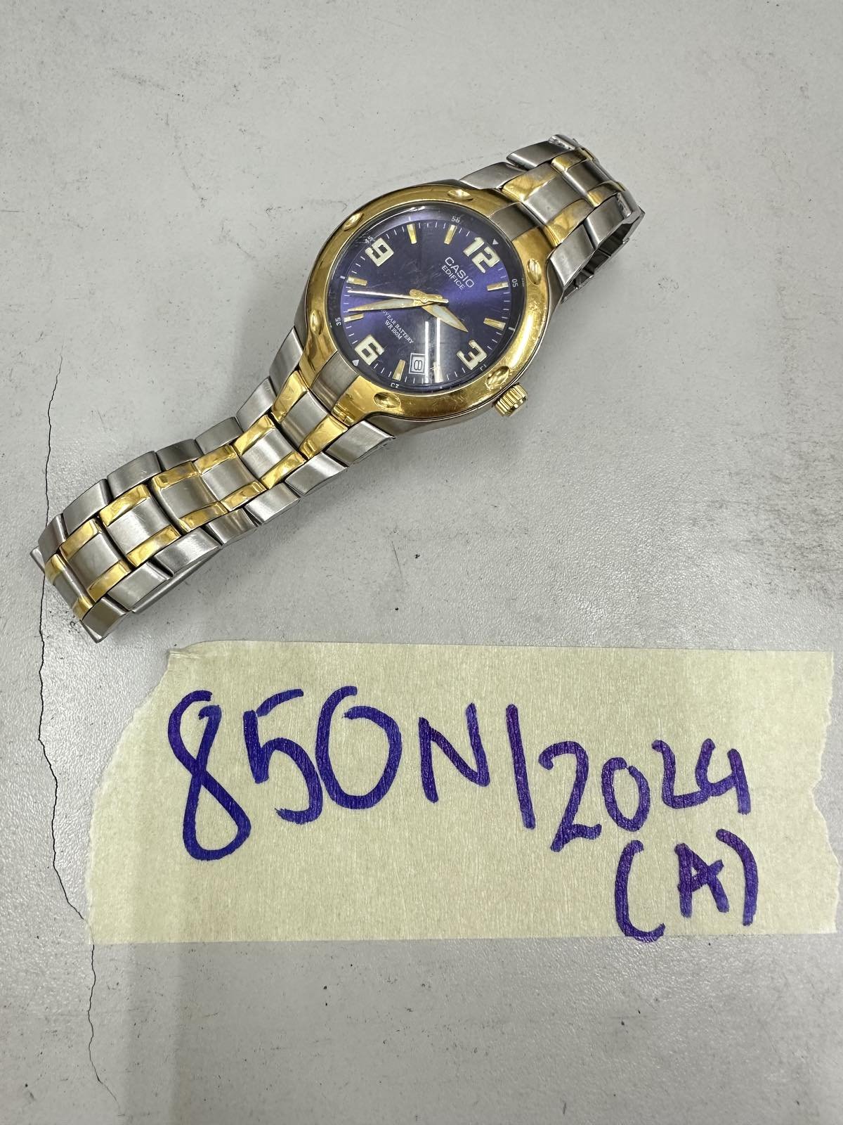 Ngày tiếp nhận: 02/6/2024 Mã hồ sơ: 850N2024A Mô tả: 01 đồng hồ mặt hình tròn, có chữ Casio, viền màu vàng, dây đeo kim loại màu trắng xen kẽ vàng. |