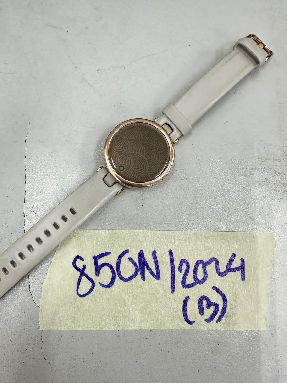 Ngày tiếp nhận: 02/6/2024 Mã hồ sơ: 850N2024B Mô tả: 01 đồng hồ mặt hình tròn, viền màu vàng đồng, mặt sau có chữ Garmin dây đeo cao su màu xám. |