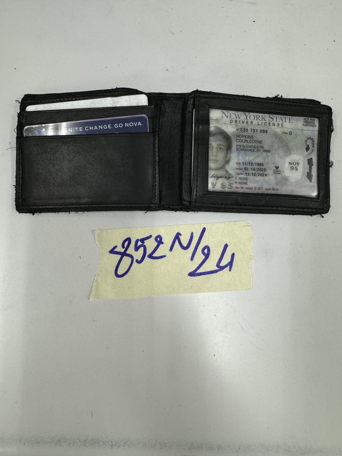 Ngày tiếp nhận: 02/6/2024 Mã hồ sơ: 852N2024 Mô tả: 01 ví cá nhân màu đen bên trong có chứa 01 GPLX Hoa kỳ mang tên HOPKINS COLIN COY NE, 03 thẻ ngân hàng mang tên COLIN HOPKINS. |
